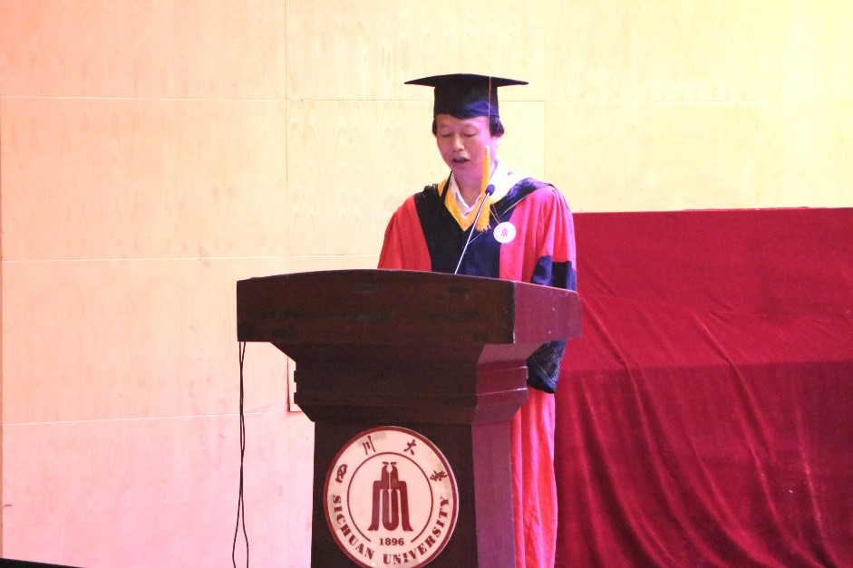 Graduate representative, clothing and costume design professional student, Yanqing Ma reviewed the experience of college of Light Industry, Textile & Food Engineering in Sichuan University in the past four years, thanked the school and the college culture for their profound influence, and called all the graduates to bravely pursue the infinite possibilities.