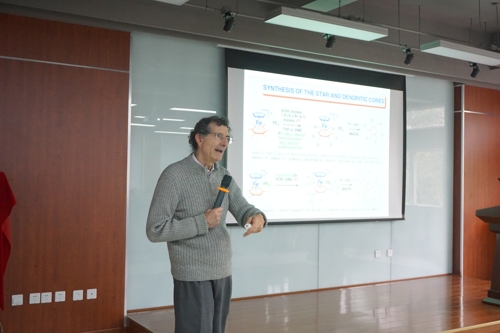 Didier Astruc院士在讲座开始时,首先对二茂铁的历史进行了简单的回顾,并介绍了在该领域内著名科学家的研究事迹。然后介绍了含有二茂铁的树枝状大分子的合成方式以及相应的表征方法,并特别介绍了二茂铁的氧化还原反应性及电化学性质。最后,Didier Astruc院士介绍了二茂铁基树枝状大分子在催化、分子识别、载药等方面的应用。通过此次报告,使同学们了解到科学研究的思路与方法,学习到科学家们钻研学术的严谨态度,开阔了眼界。在讲座的提问环节,同学们踊跃发言,积极地与Didier Astruc院士进行讨论。