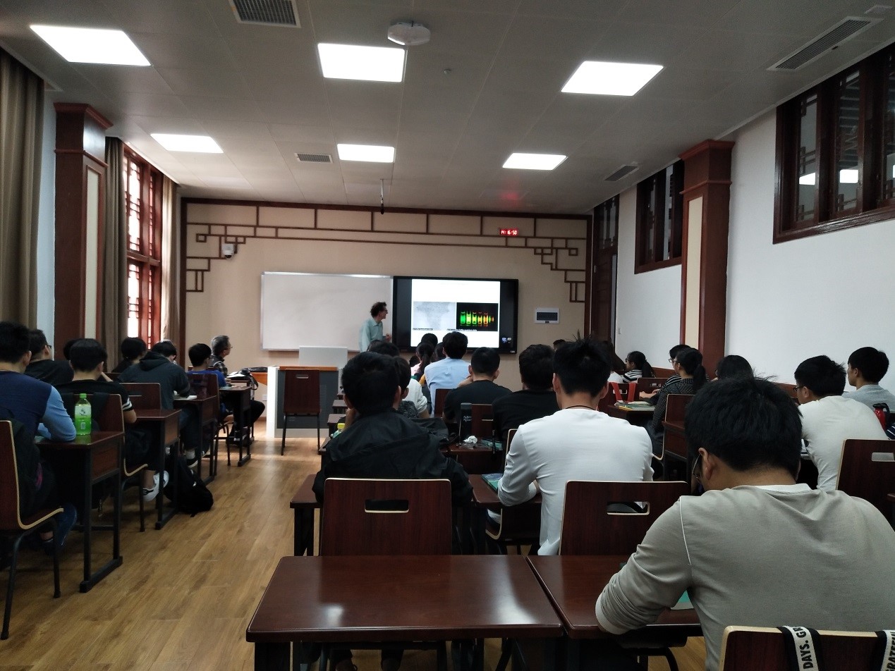 讲座开始时,Didier Astruc院士向同学们介绍了其所在的城市——法国波尔多的历史文化和特色建筑。随后,Didier Astruc院士向同学们讲授的纳米科学(nanoscience)”的历史,引出纳米材料(nanomaterials)的定义、类型及分类。然后,以纳米金为例,详细的介绍了纳米金的性质及研究现状,并特别介绍了在不同条件下纳米金所形成的不同颜色。最后,列举了纳米金在生物医药、导体、催化等方面的应用。Didier Astruc院士的报告幽默风趣,内容深入浅出,激起了在座同学们的浓厚兴趣。在讲座的提问环节,同学们踊跃发言,积极地与Didier Astruc院士进行讨论。