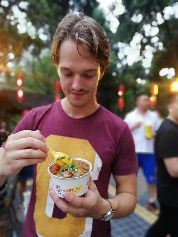 从武侯祠出来以后,一行人继续游览旁边非常具有成都特色的锦里。熙熙攘攘的人群,各式各样的民俗小店,向留学生们展示着成都不一样的繁华。从街头开始,留学生们几乎没有遗漏的把所有的店铺逛了一遍,购买了一些觉得十分新奇的小物件做纪念品,还品尝了许多美食。其中一位尤其喜欢中国的辣椒的留学生买了小米椒作为特产带回家乡,并大胆尝试他们国家的人食谱里从未出现过的脑花和臭豆腐。另一位女孩子看到街头有手艺人吹糖人和做棉花糖,非常兴奋。她告诉志愿者,她之前在脸书上看到网友来中国旅游时上传的吹糖人和做棉花糖的视频,非常喜欢,一直希望来到中国能够亲自见识一下,现在如愿以偿。玩到傍晚正好赶上一处露天茶馆在表演变脸,大家坐在茶馆里一边休息一边观看表演,体会成都人民惬意的生活情调。