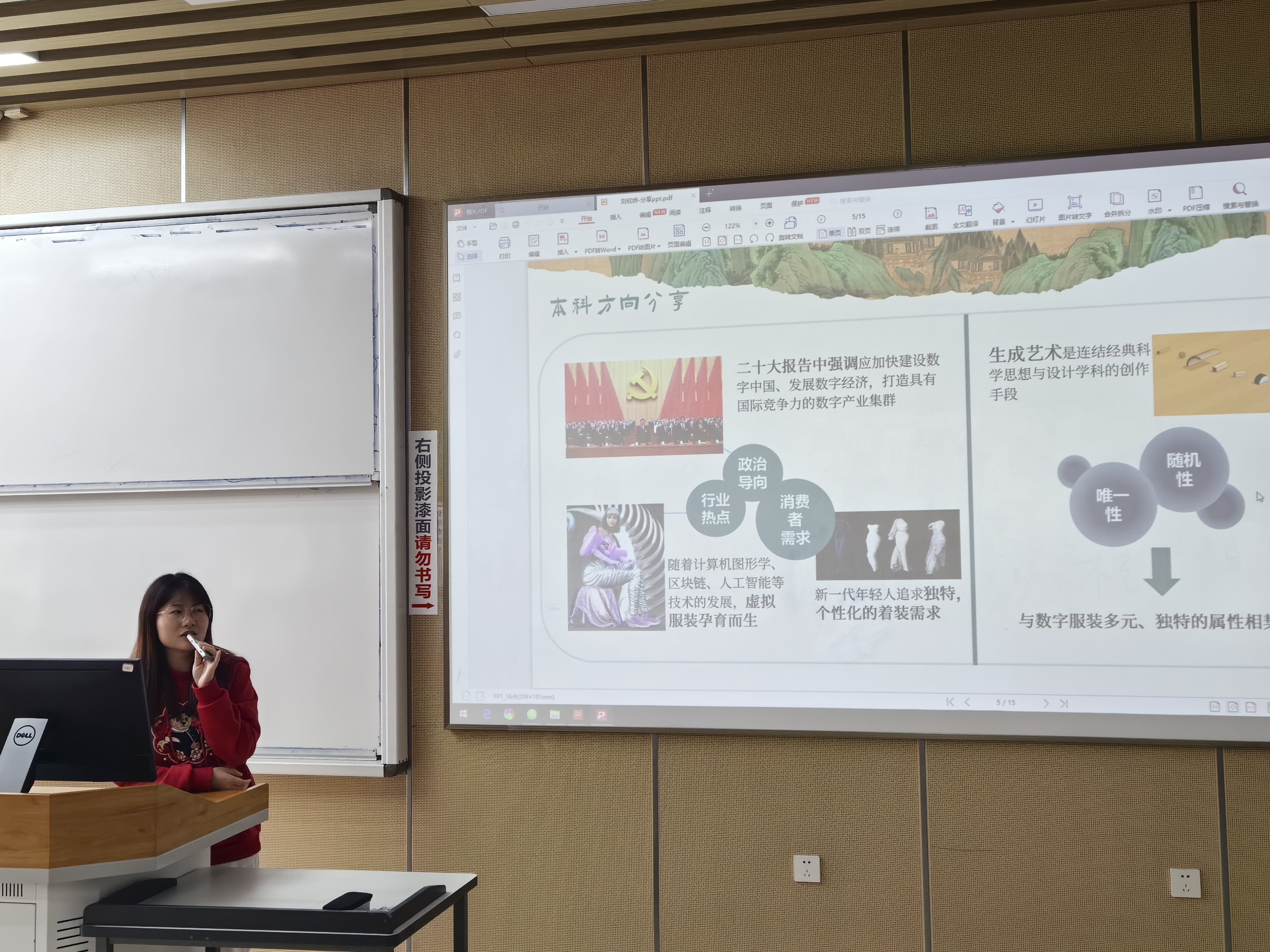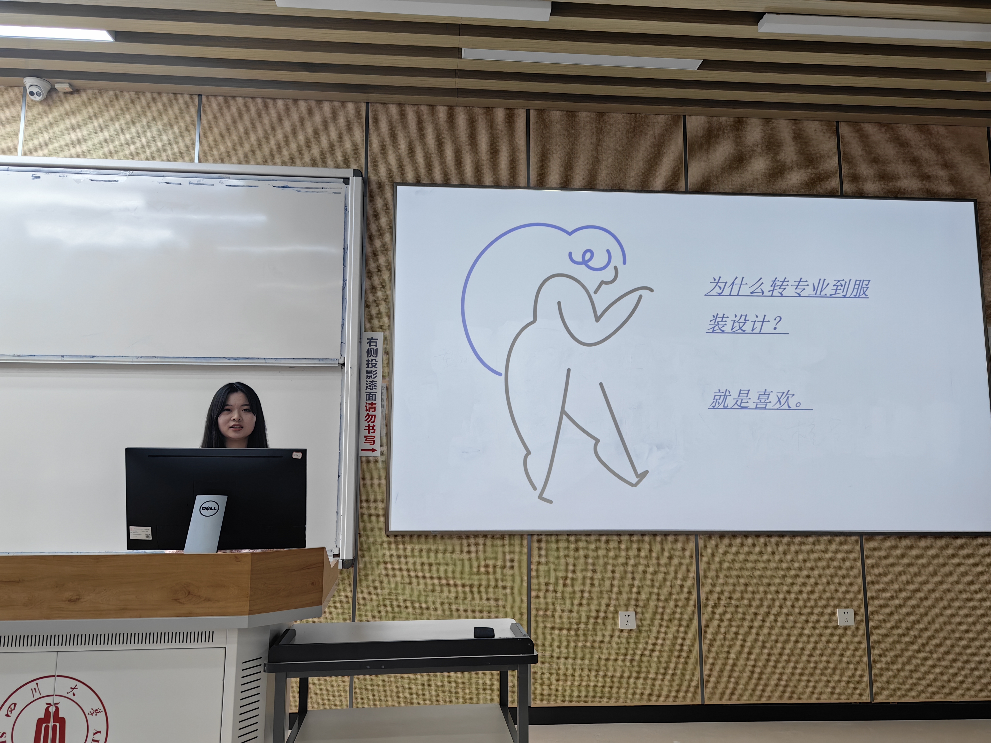 其次,服装与服饰设计系主任杨璐铭教授给同学们介绍了本专业的历史沿革、办学定位、培养目标、师资力量、人才培养体系及丰富多彩的实践及国际交流活动。同时,与同学进行了深入的交流与互动。