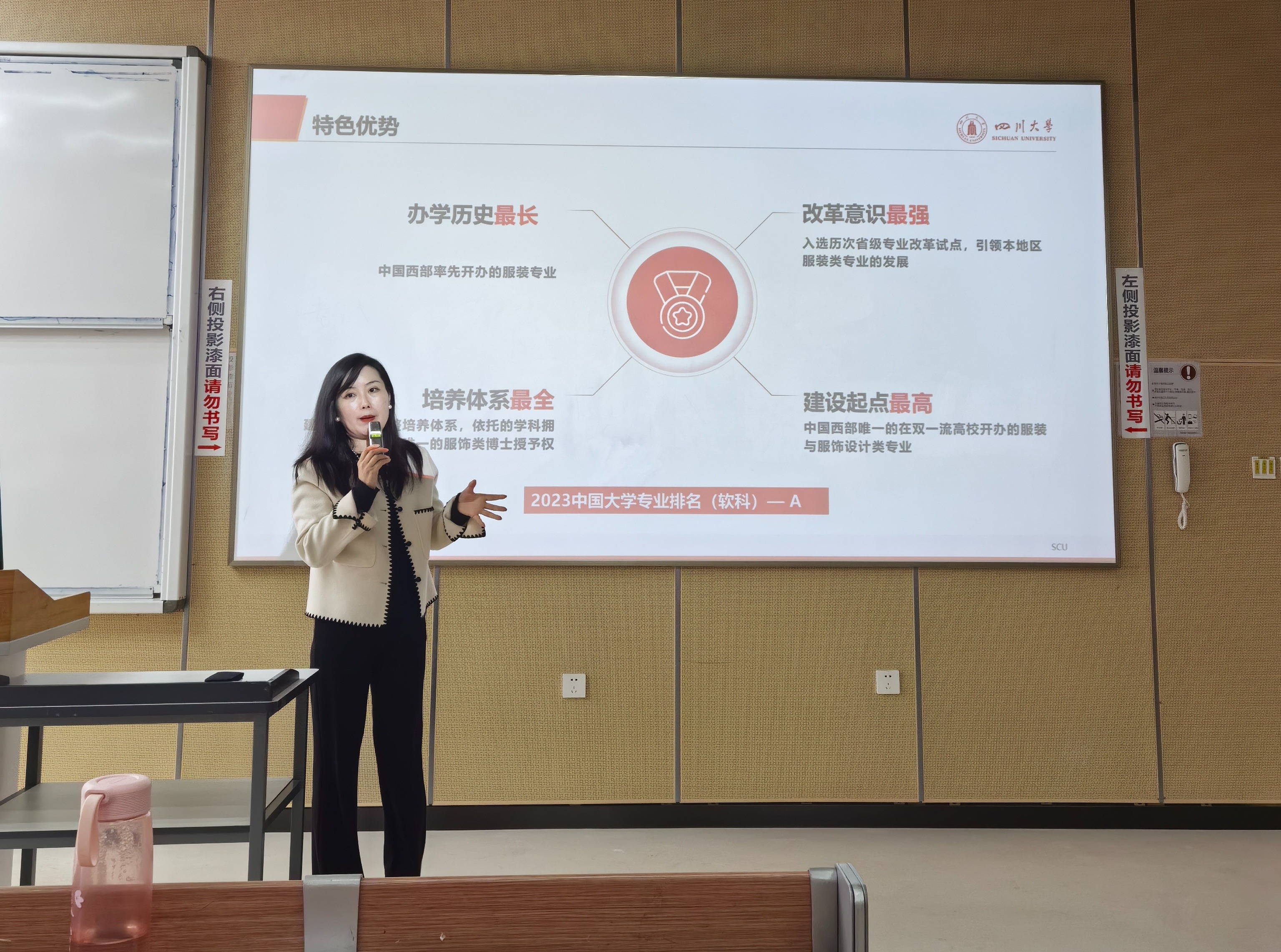 首先,党委副书记冯国涛副教授致辞。冯书记结合我校服装与服饰设计专业的特点,从bw必威西汉姆联官网服装与服饰设计专业的整体实力、学院对本科生人才培养的高度重视以及学院学生管理团队对学生的成长呵护三个方面介绍了留在本专业继续学习的三大优势,并希望同学们全面分析自我特长,并作出理性选择。