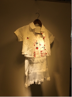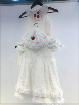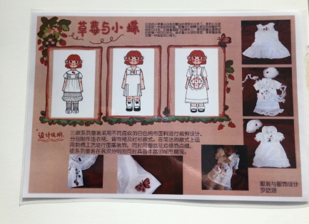 以上系列连衣裙设计师罗屹瑶草莓为主题白色为底色,多种不同质地的同色面辅料,红线刺绣绗缝手法,使系列的服饰主题突出层次分明小女孩纯洁可爱的特点充分展现