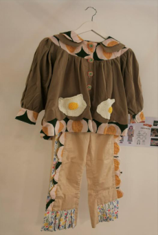 设计师赵雨歌作品灵感来自夏日的味道是柠檬”。整件作品并没有使用很多鲜艳亮丽的色彩,但却让人感受到“夏秋之交”的清凉气息。其使用了能代表季节的黄绿色为主要色彩,用小花小鸟面料述说对夏日的不舍,又以钩针元素表达了初秋尚的一丝暖意,使暗淡的底色跳跃起来,充满童趣。