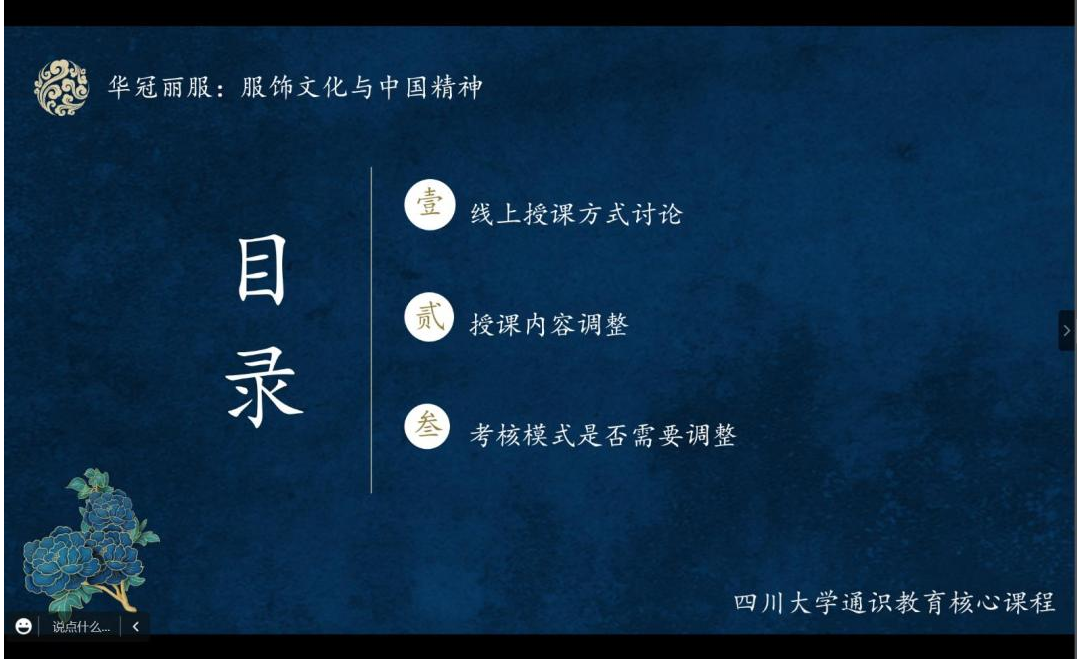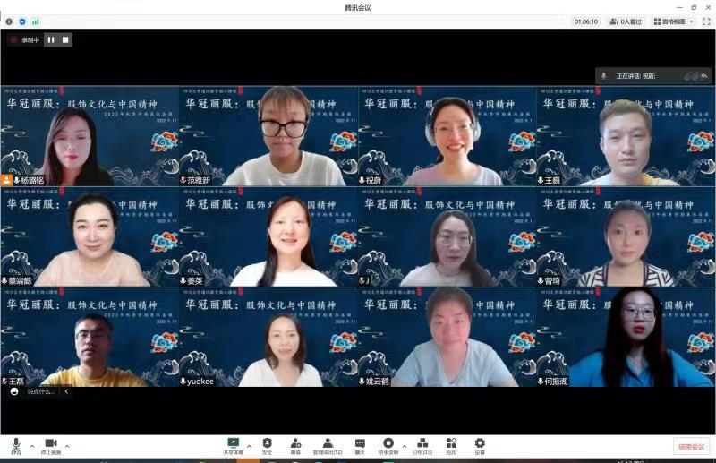 “华冠丽服:服饰文化与中国精神”是四川大学第二批通识教育核心课程,为促进课程组教师多学院、多学科的交叉融合,保证“华冠丽服:服饰文化与中国精神”课程在新一学期的顺利高效开展,便于课程组教师根据学情对课程内容及授课方式进行针对性调整,保障课程线上教学效果,课程组于2022年9月11日在腾讯会议开展本学期第一次集体备课活动。在此次活动中,课程组对本学期上课形式、课程内容、过程考核方式、期末考核标准等方面统一了思想。