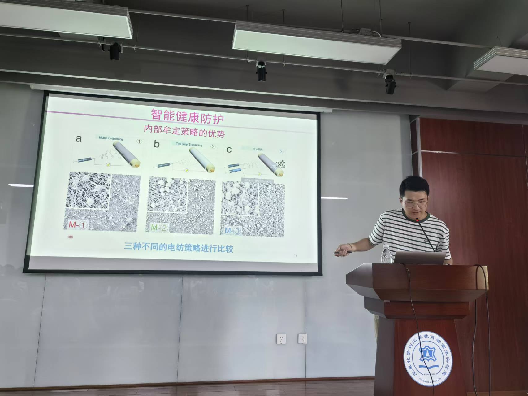 为提高本专业学生论文写作水平,了解本专业前沿问题,服装与服饰设计系特别邀请香港城市大学生物科学与工程系博士后研究员司一帆博士于2024年9月20日下午在四川大学望江校区皮革楼215报告厅开展了一场关于“仿生智能服饰与可穿戴诊疗”的讲座。参加本次活动的主要人员有服装与服饰设计系主任杨璐铭教授、服装与服饰设计系教师、本专业研究生及高年级本科生。杨璐铭教授主持本次讲座。