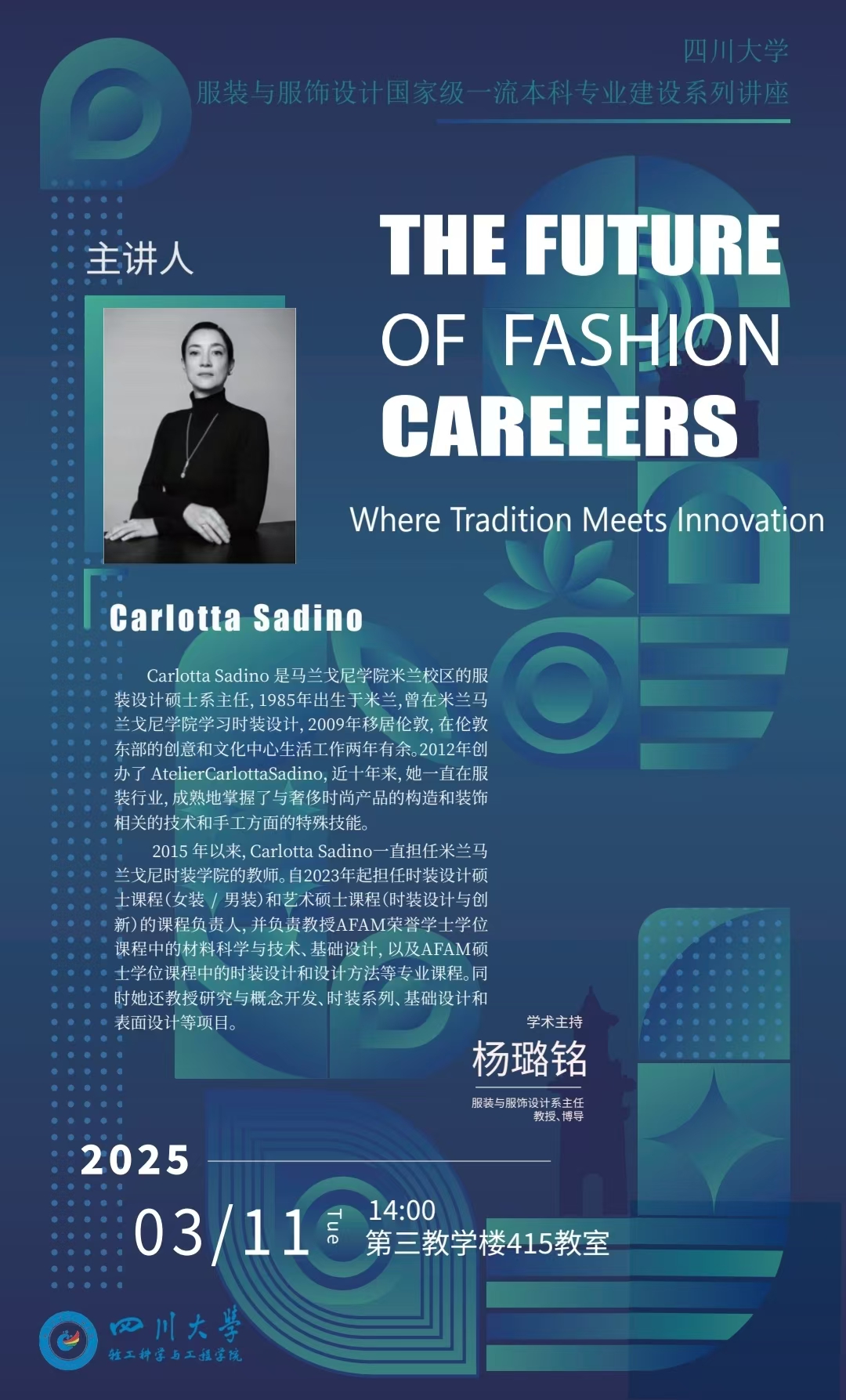 为深化国际交流、推动学科交叉创新,3月11日下午,bw必威西汉姆联官网服装与服饰设计系“艺术+科技”系列学术讲座在望江校区顺利举行。本次活动同时作为《服装专业英语》课程的嵌入式课堂讲座,特邀意大利马兰戈尼学院米兰校区服装设计硕士系主任Carlotta Sadino女士担任主讲嘉宾,以“时尚职业的未来:传统与创新融合”为主题,吸引了服装与服饰设计系师生、研究生及高年级本科生等近百人参与。