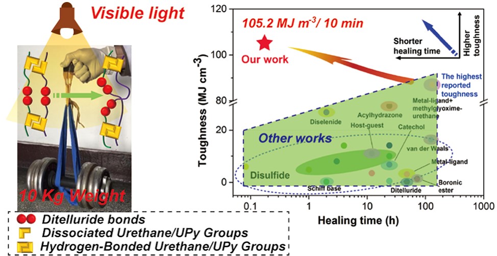 该团队还利用具有可见光动态响应特性的双碲键(126 KJ /mol),通过在水性聚氨酯的分子主链同时引入动态双碲键和2-脲基-4[1H]-嘧啶酮(UPy)四重氢键作用,合成出具有的室温可见光自修复特性的超分子水性聚氨酯(DTe-WSPs)。通过调节DTe-WSPs中的双碲含量和UPy含量,在DTe-WSPs中同时实现了快速室温可见光自修复(光照10 min修复效率85.6%)和高力学性能(拉伸强度、断裂伸长率和韧性分别为19.47 MPa、1144.3%和105.2 MJ m-3),且其韧性达到目前已报道的室温自修复高分子材料的最高水平。