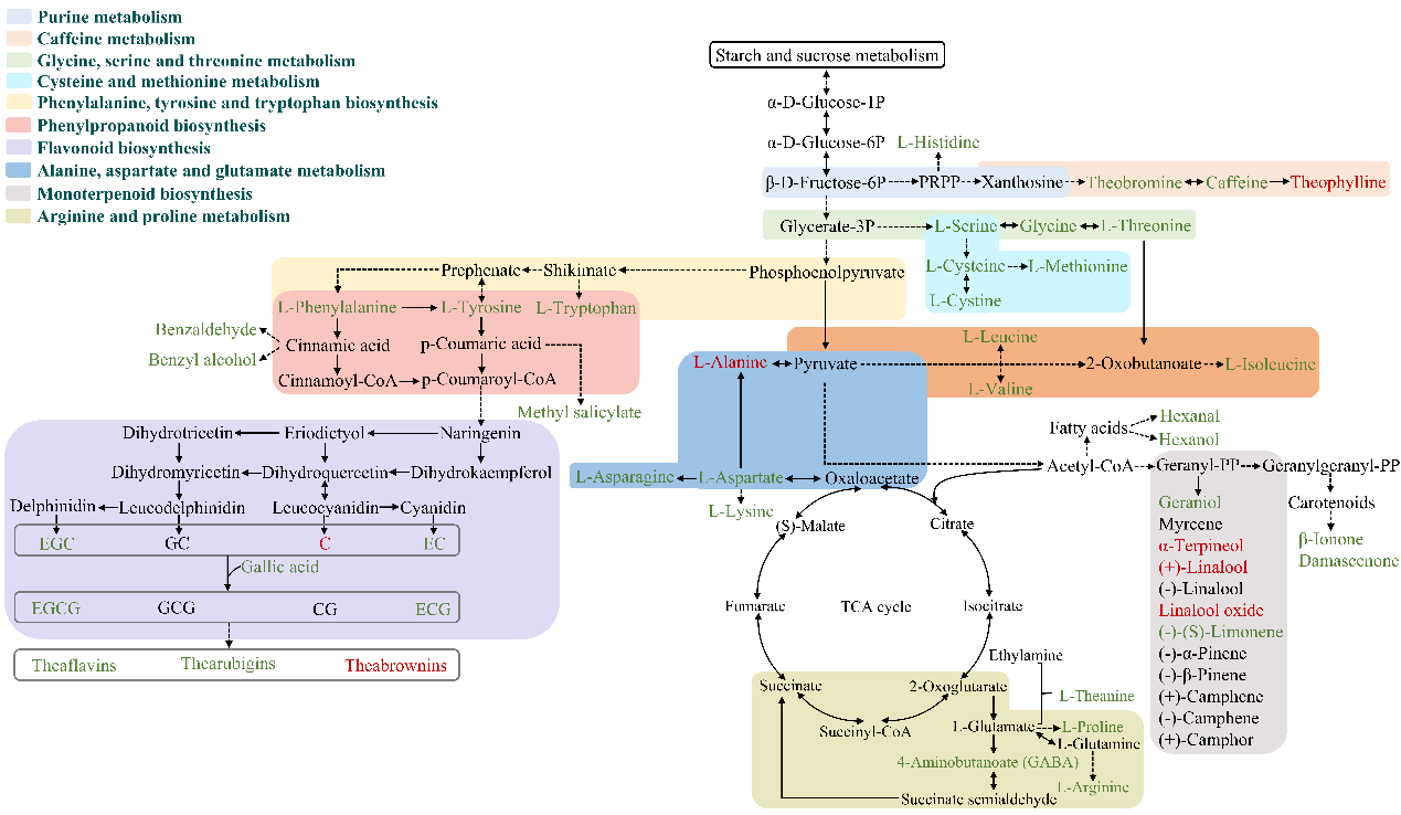 GC-MS分析结果显示,秋茶中醇类挥发性成分的含量在冠突散囊菌PW-1发酵后显著增加,其中呈花果香味的(Z)-芳樟醇氧化物、芳樟醇、(E)-芳樟醇氧化物(呋喃型)和 1-辛烯-3-醇的含量最高,表明菌株PW-1显著提升了秋茶的香气品质。代谢途径分析结果显示,冠突散囊菌PW-1提升秋茶品质主要与丙氨酸、天冬氨酸和谷氨酸代谢途径,甘氨酸、丝氨酸和苏氨酸代谢途径,氨酰-tRNA 生物合成途径,精氨酸生物合成途径以及精氨酸和脯氨酸代谢途径的表达相关。