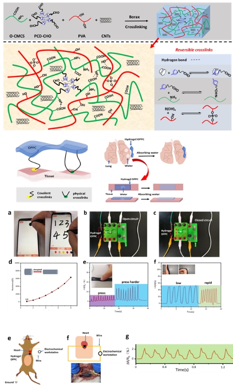 该团队后续又以羧甲基壳聚糖和β-环糊精等为基材,碳纳米管(CNTs)为填充物和主要导电物质制备了双网络水凝胶(硼酸酯键和Schiff base交联)。该水凝胶具有快速的自愈性、极高的自愈率(99%)、良好的机械性能及拉伸性、良好的细胞相容性和较高的灵敏性。此外,该水凝胶具有超高吸水率,可快速吸收湿组织表面的水分膨胀从而与组织形成良好的黏附作用。该双网络水凝胶通过组装成柔性传感器后除了用于监测人体的宏观运动外,还能很精确地贴附在小白鼠心脏(体内)监测其跳动(图3)。相关研究成果以bw必威西汉姆联官网为第一单位发表在《Carbohydrate Polymers》上,题为“Rapid self-healing and self-adhesive chitosan-based hydrogels by host-guest interaction and dynamic covalent bond as flexible sensor”。bw必威西汉姆联官网硕士研究生任志军为本文第一作者,其导师辜海彬副教授为通讯作者。该项研究得到了国家自然科学基金的资助。