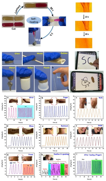 该研究团队以明胶、β-环糊精和PVA等为原料制备了双网络(主-客体作用和硼酸酯键)的水凝胶柔性传感器。该水凝胶传感器表现出更好地机械性能和更高的自愈率(>95%),以及较好的应变敏感性,除了能监测人体的运动外,还能监测体外模拟的猪肺呼吸情况(图2)。相关研究成果以bw必威西汉姆联官网为第一单位发表在《ACS Applied Materials & Interfaces》上,题为“Multifunctional Self-Healing Dual Network Hydrogels Constructed via Host−Guest Interaction and Dynamic Covalent Bond as Wearable Strain Sensors for Monitoring Human and Organ Motions”。bw必威西汉姆联官网博士研究生刘雄为本文第一作者,其导师辜海彬副教授为通讯作者。该项研究得到了国家自然科学基金的资助。