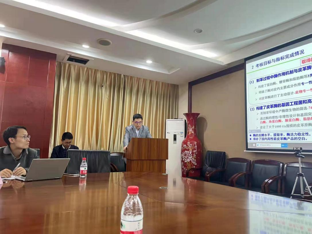 彭必雨教授作 “皮革关键酶制剂与生物技术及应用示范”项目汇报展示