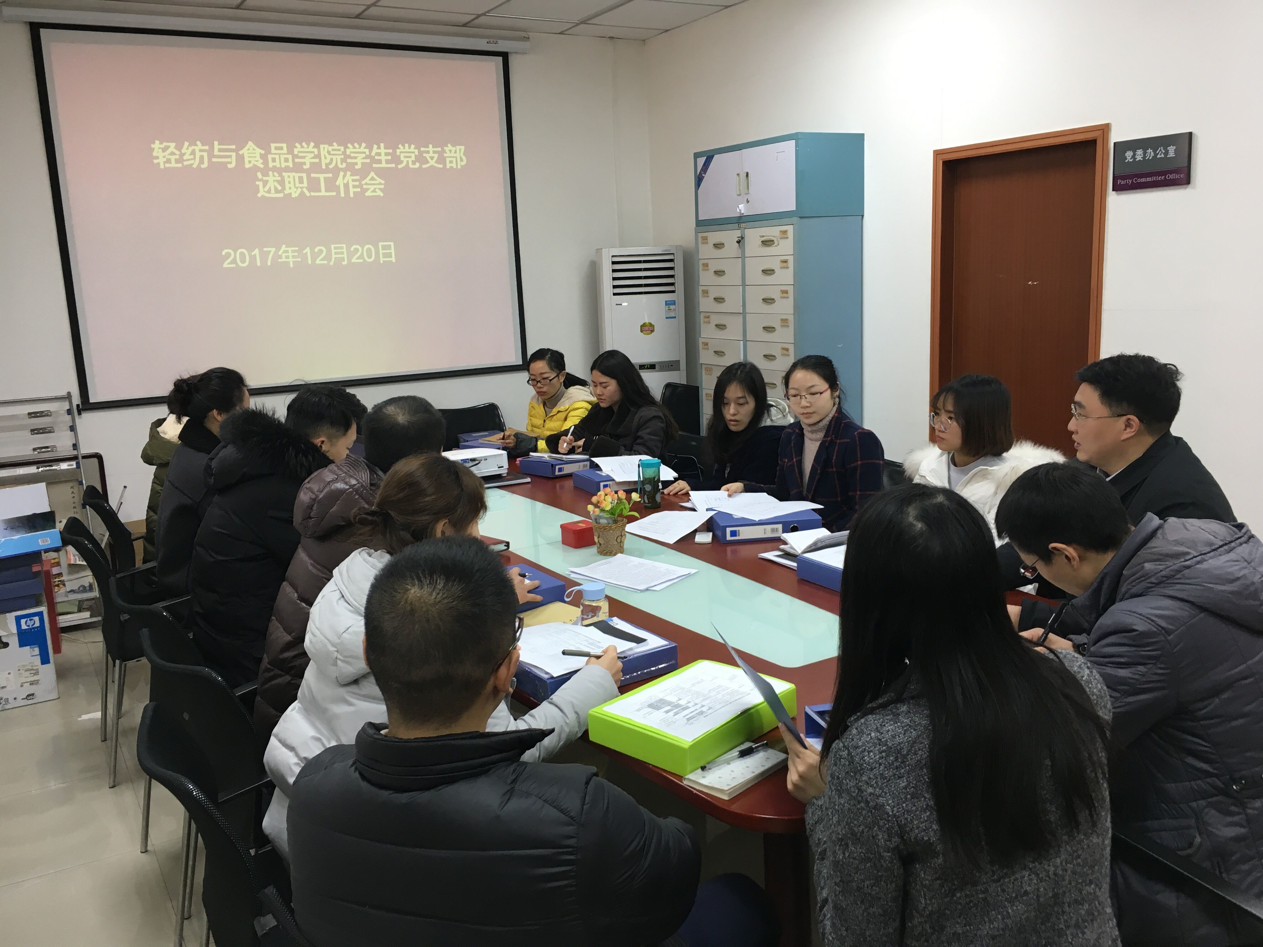 2017年12月20日中午12:30,轻纺与食品学院2017年学生党支部书记述职大会在纺工附楼201召开,党委书记刘晓虎副教授、党委副书记冯国涛老师以及12位学生党支部书记参加了此次会议,会议由党委副书记冯国涛老师主持。