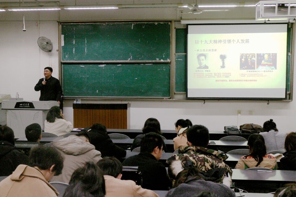 最后,刘书记结合学校实际,专门就“以十九大精神引领个人发展”做了重点讲解。刘书记要求新时代要有新气象,牢固树立慢进就是后退的意识,要始终保持只争朝夕的好状态。要明确全面成长、民族复兴、人类进步的责任和使命。要通过科学理论的武装、高尚品格的涵养、艰苦环境的磨砺、批判方式的自省来坚定理想信念。要向伟人先贤们学习,树立远大的奋斗目标。要抓住现阶段和未来人才强国战略推进、一流大学建设、创新驱动引领的大好机遇,实现个人全面发展。同时,要充分认识到国家安全面临复杂形势、国家发展面临的艰巨任务、我们的就业形势依然严峻等各种挑战,积极面对,主动作为。当前,大家应积极追求思想上的进步,珍惜宝贵学习资源,打牢基础并拓展知识面,积极参加社会工作锻炼,储备实践经验,专注自我发展的同时也要关注社会,牢固树立“四个正确认识”,加强自我管理,紧绷意识形态之弦,理性表达爱国情感。