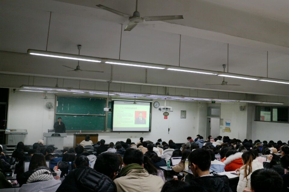 为贯彻中共中央、国务院《关于加强和改进新形势下高校思想政治工作的意见》(中发〔2016〕31号)文件精神,落实“学院党委书记、院长每学期至少分别为学生上1次思想政治理论课”的工作要求,2017年12月15日晚,轻纺与食品学院党委书记刘晓虎副教授深入2016级本科生形势与政策课课堂,为2016级全体同学做了“以党的十九大精神引领全面发展—新时代、新状态、新境界、新作为”为题的专题讲座。辅导员王舒灏老师及2016级全体学生聆听了讲座。