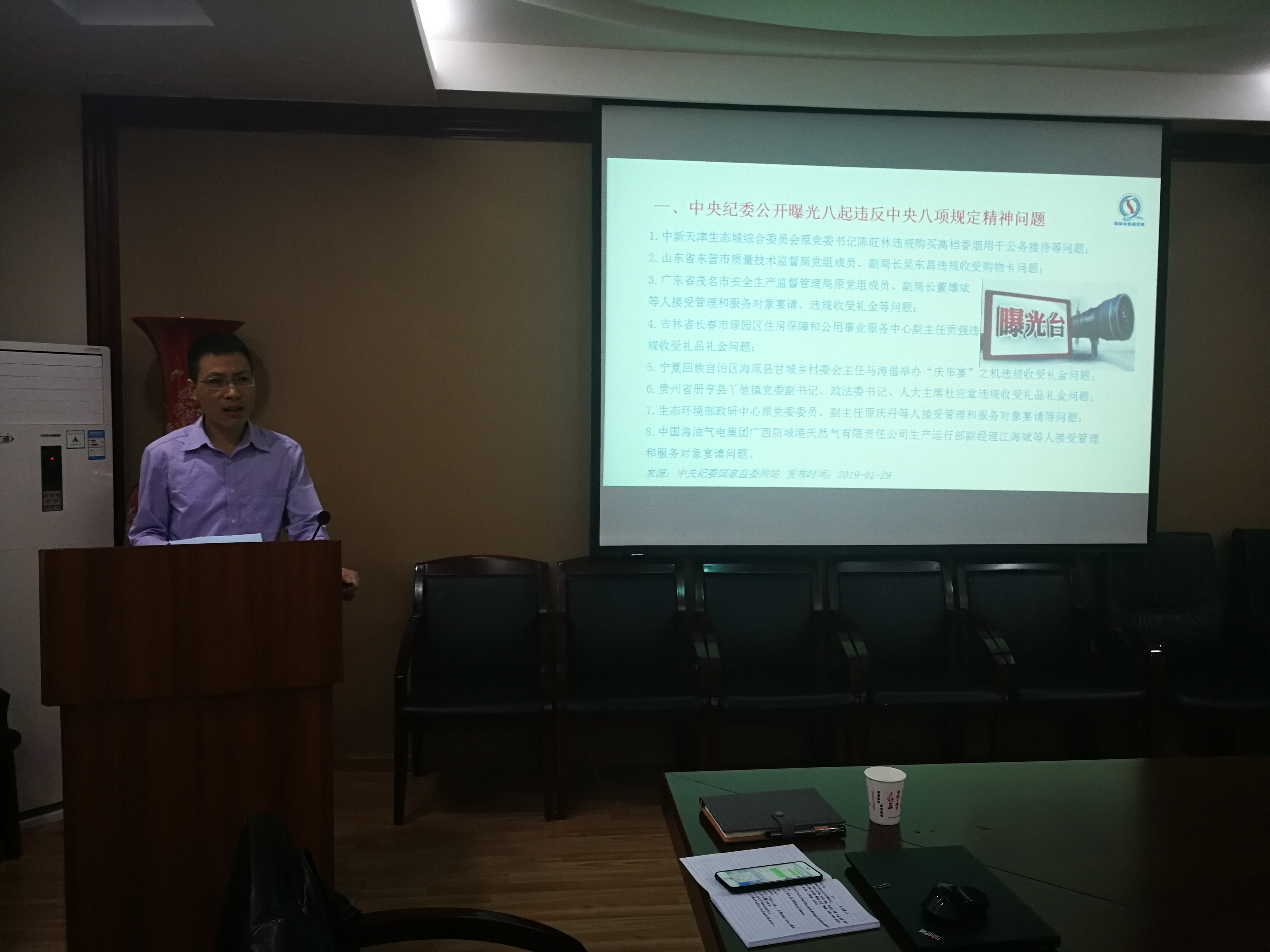 会议首先由冯国涛副书记做“党风廉政教育宣传月活动”的报告。接着刘晓虎书记向与会人员作“中共中央关于加强党的政治建设的意见”的专题辅导报告;冯国涛副书记作”警示教育”;何有节院长作“财经使用规范”报告。最后,全体与会人员签订了党风廉政建设责任书。