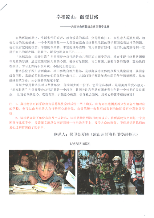学院工会与凉山甘洛县团委共同开展“幸福凉山,温暖甘洛”儿童圆梦公益行动,希望通过我们的关爱,让甘洛县贫困留守儿童感受到社会的关爱。也许我们小小的奉献,会成为他们最珍视的礼物,为他们营造一个良好的学习生活环境,让他们在社会这个大家庭里健康快乐成长。首次活动安排如下: