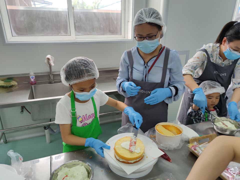 制作现场热闹非凡,弥漫着浓浓的甜蜜和快乐。在面点老师的指导和示范下,孩子们和家长一起大展身手,发挥想象在蛋糕胚上绘出美丽的奶油图案,用水果来点缀蛋糕出缤纷多彩的造型,享受节日温馨愉悦的亲子时光。
