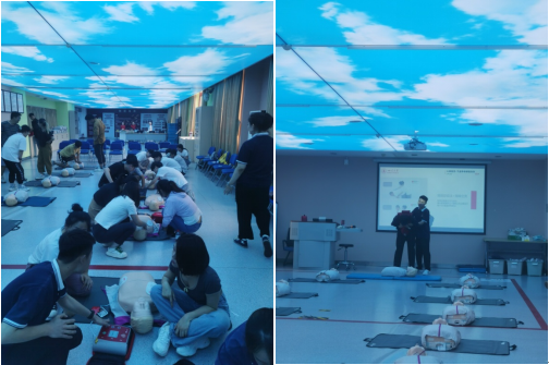 培训分为两个阶段,第一阶段为急救技能培训,第二阶段为灭火技能培训。第一阶段授课老师系统讲授了心肺复苏技巧、AED使用方法和海姆立克急救法,随后授课教授指导参训师生利用教具进行了实际演练。在心肺复苏训练中,授课教师重点对心肺复苏时的按压频率、按压深度和按压手法进行了指导,以确保急救获得理想的效果。在AED的使用培训中,授课教师着重对如何正确使用仪器进行了指导,以免施救者受到电击伤害。在海姆立克急救法培训中,授课教师与参训师生互动完成演示。