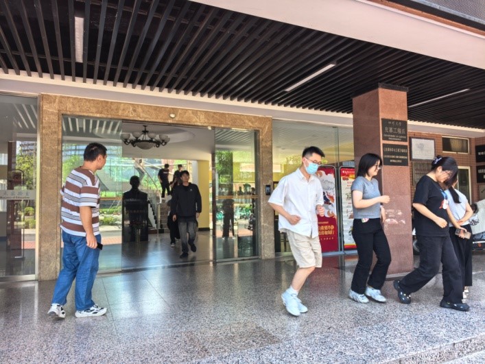 演练正式开始后,皮革楼内施放模拟烟雾,烟感报警主机接收到烟雾信号后,值班人员第一时间通过应急广播系统发布疏散指令。在楼内工作的师生员工收到疏散指令后,在现场引导人员的指挥下有序撤离至应急避险区。经过近10分钟的撤离和人员清点,楼内所有人员完成撤离,演练顺利结束。