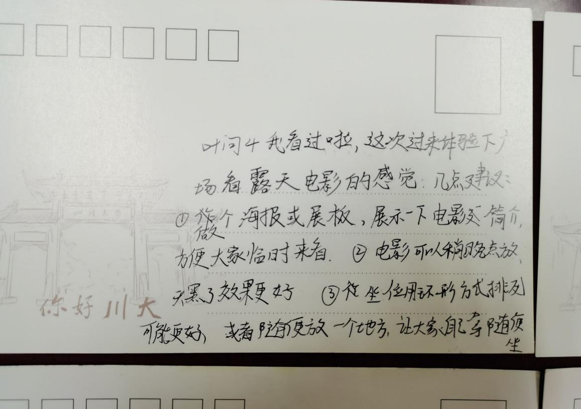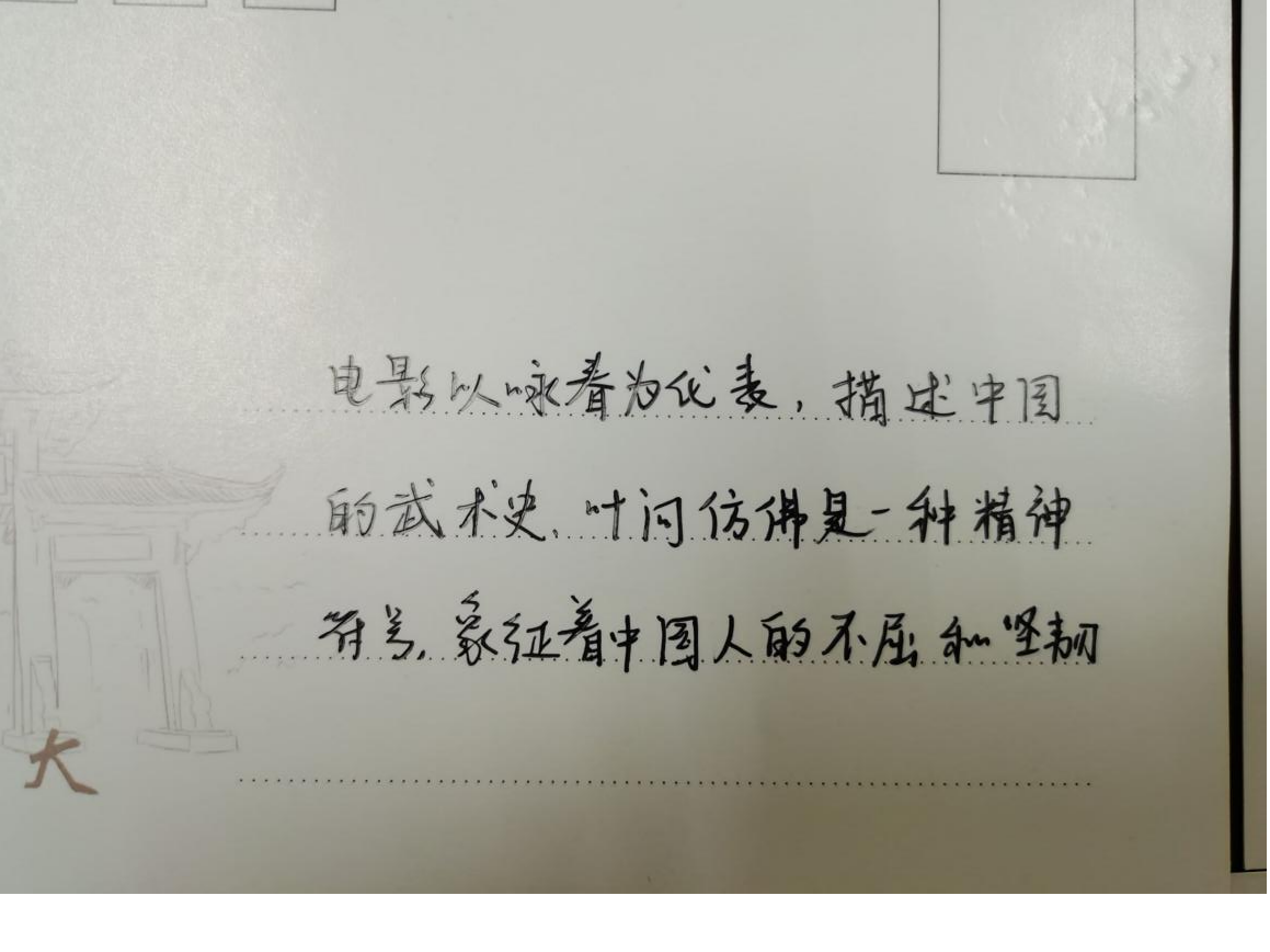 观影过程中,活动负责人向同学们分发明信片,大家纷纷用文字记录下自己的观影体会。同学纷纷表示,中华文化,博大精深;中国功夫,值得传扬;中国人不屈的精神应当被传承。同学们也深深被以叶问为代表的中国人不屈和坚韧精神所感动。
