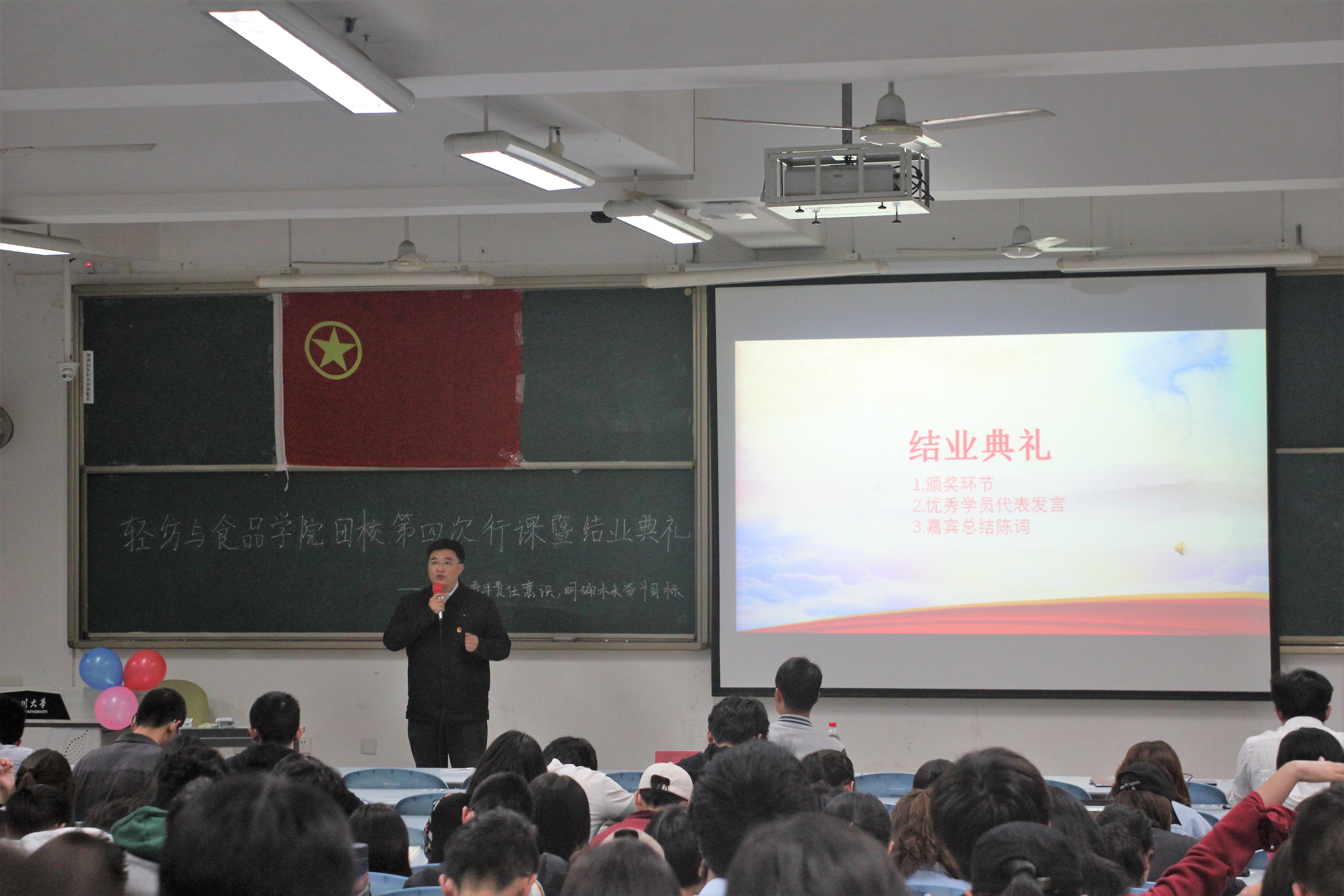 2018年4月15日晚19点整,轻纺与食品学院2017级团校第四次行课暨结业典礼于综合楼C座207举行。本次团课由四川大学轻纺与食品学院党委书记刘晓虎副教授主讲,bw必威西汉姆联官网团委副书记向星烨老师与全体2017级团员青年到场参加本次团校学习。