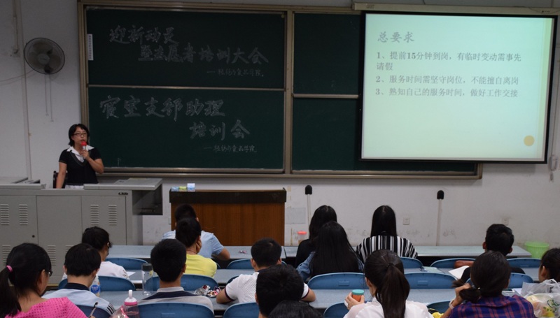 团委副书记李晓秀老师首先对志愿者们积极热情的态度表示肯定,表扬了在迎新工作中付出辛勤努力的团学干部。李老师指出,迎新工作将会对新生入学乃至以后的学习生活产生巨大影响,并向志愿者提出迎新志愿工作的总要求,希望志愿者能重视工作细节,将迎新工作做到最好。