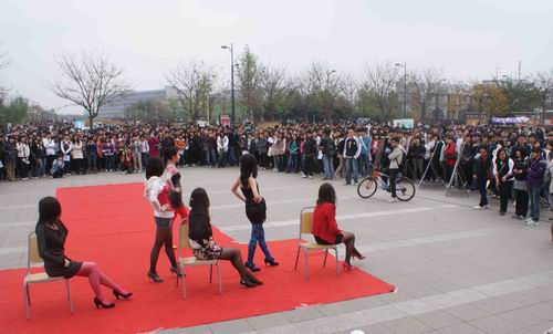 11:40,“衣秀杯”服装大赛的日常装走秀正式开始,由08、09级同学共同策划导演的走秀以其别致而又新潮的姿态展现在全校同学眼前,学院、街头、复古等各式风格引起了现场观众的阵阵欢呼与掌声。