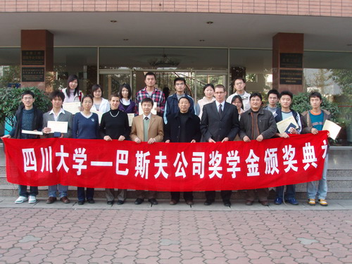 2007年11月27日13:30,四川大学—BASF奖学金颁奖典礼在皮革楼报告厅举行。参加本次颁奖典礼的有巴斯夫(中国)有限公司大中华区总经理贝格博士、范嘉宜博士、巴斯夫(中国)有限公司大中华区助理技术服务经理项超先生、院长陈武勇教授、院党委副书记刘晓虎老师以及生物质与皮革工程系林炜教授,颁奖典礼由院团委副书记冯国焘老师主持。
