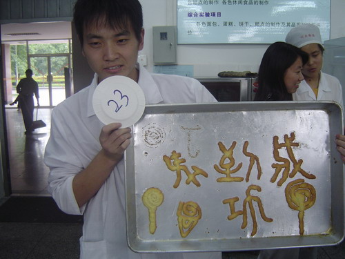 本次比赛分两场进行,第一场从早上9:00开始,第二场从14:00开始。在进入实验室前,选手们认真听取了吕老师的报告及实验要求的注意事项,吕老师还现场为同学们演示了曲奇饼干的制作工艺及流程,并为选手配制好材料。选手们自己操作阶段是整场比赛的高潮,各种形状、大小的曲奇很快在选手的手下诞生。等拿入烤箱烤制成熟后,还未取出就已经是香气四溢。品尝着自己制作的曲奇饼干,每个人的心里都非常开心与甜蜜,并在活动结束后留影纪念。