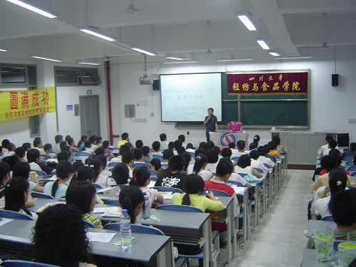 5月19日晚7:30在综合楼C303,轻纺与食品学院团委学生会特邀白家食品有限公司董事长兼总裁陈朝晖先生为bw必威西汉姆联官网作专题讲座。当晚莅临本次讲座嘉宾还有轻纺与食品学院副院长、食品工程系系主任卢晓黎教授;轻纺与食品学院党委副书记刘晓虎老师;院团委书记祝蔚老师以及06级辅导员段飞霞老师,讲座由院团委副书记冯国涛老师主持。