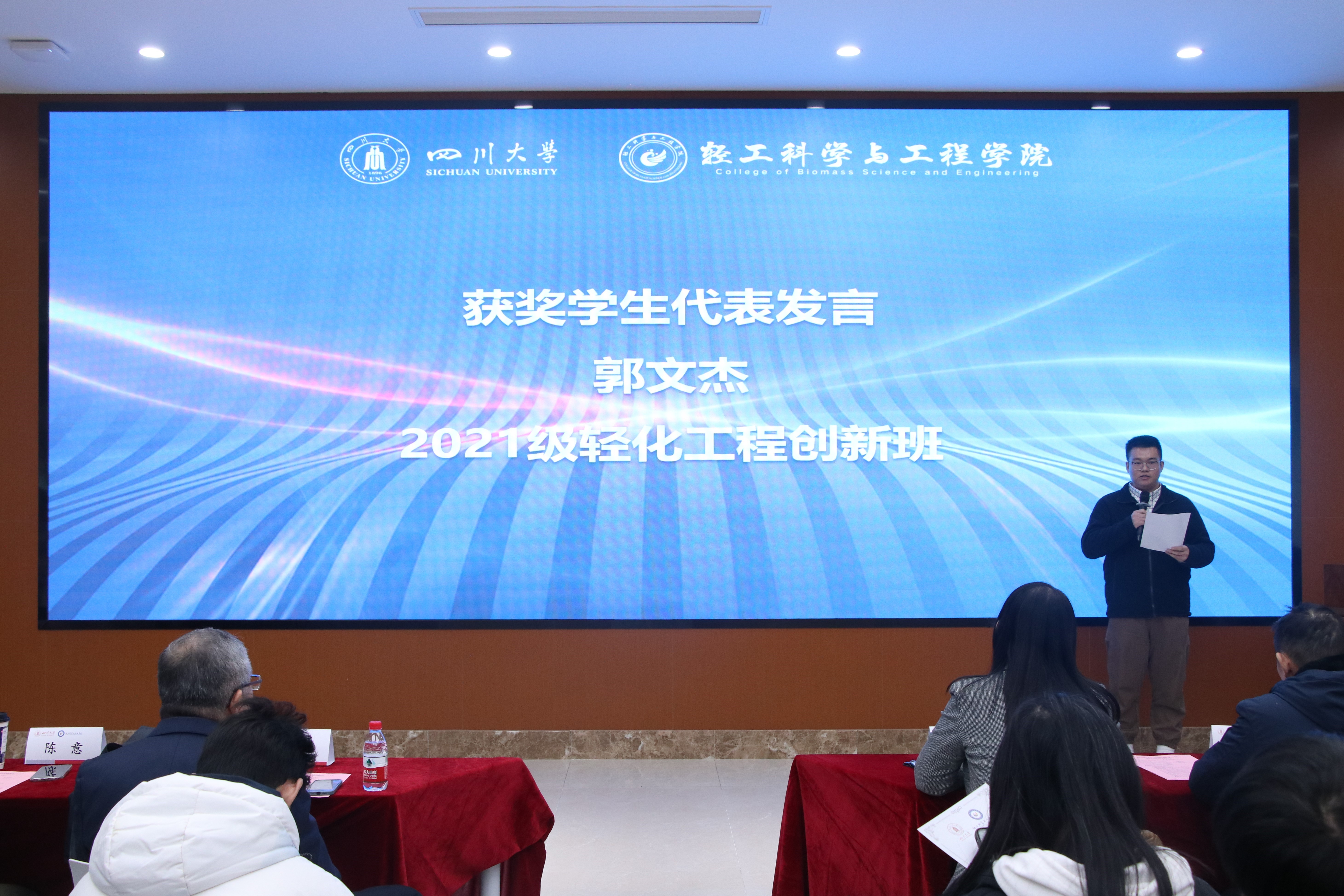 接着,生物质与皮革工程系副系主任程海明教授宣读《四川大学生物质与皮革工程系2024年度优秀个人及集体表彰决定》。在欢快并隆重的颁奖音乐中,设奖单位的嘉宾与学院的领导们为获奖同学逐一颁奖,并合影留念,共同记录下这一荣耀时刻。