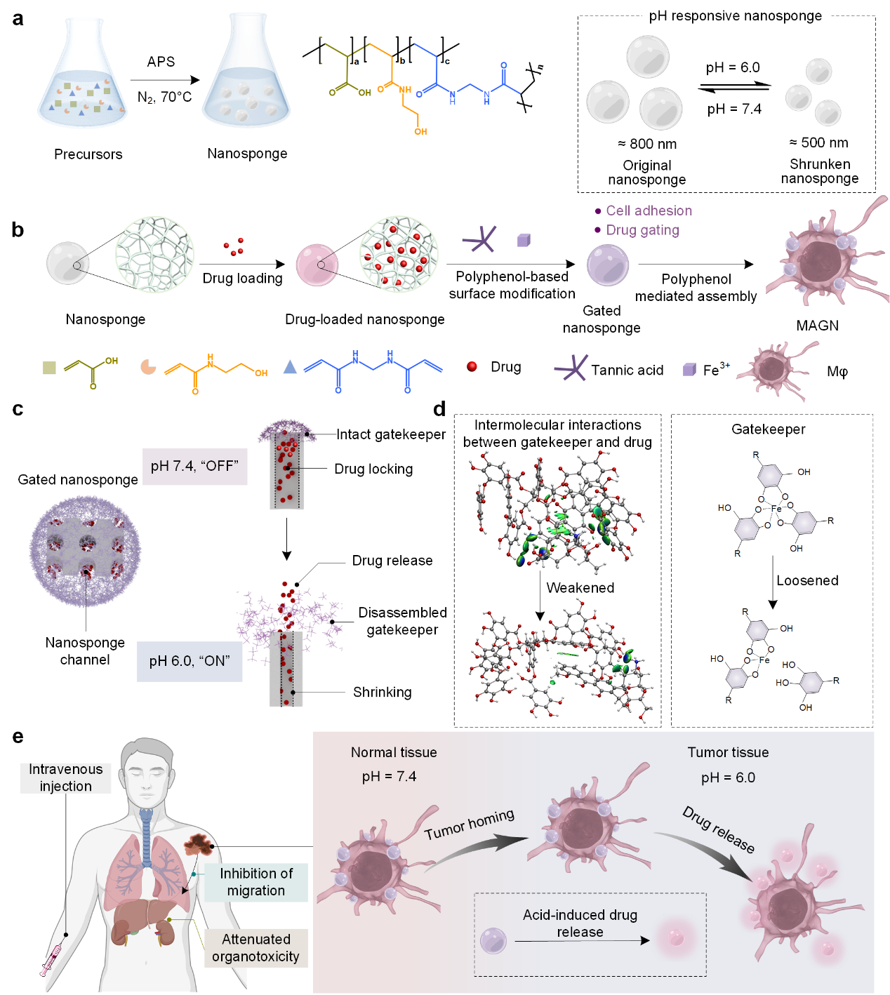 近日,郭俊凌教授团队开发了一种由金属多酚网络构建的纳米多孔门控系统,用于控制微凝胶的药物释放,并将其与巨噬细胞结合,构建了对肿瘤具有靶向富集和药物递送的细胞治疗系统,称为MAGN,该研究成果发表于国际顶级期刊Advanced Science》(影响因子17.5。研究基于纳米海绵丰富的孔隙结构和pH响应功能等物理化学特性、多酚与金属离子在纳米海绵表面自组装形成具有分子门控系统,结合巨噬细胞对肿瘤具有靶向富集作用,从而提出了药物封堵和药物递送的新型策略(如图)。该研究发现,在不影响巨噬细胞活性和正常迁移侵袭能力的前提下,MAGN能够携带高剂量抗癌药物DOX富集在肿瘤微环境中更有效地杀死肿瘤细胞,抑制肿瘤生长。MAGN输送DOX至肿瘤部位的效率是游离DOX的三倍,并证实了MAGN的体内安全性。