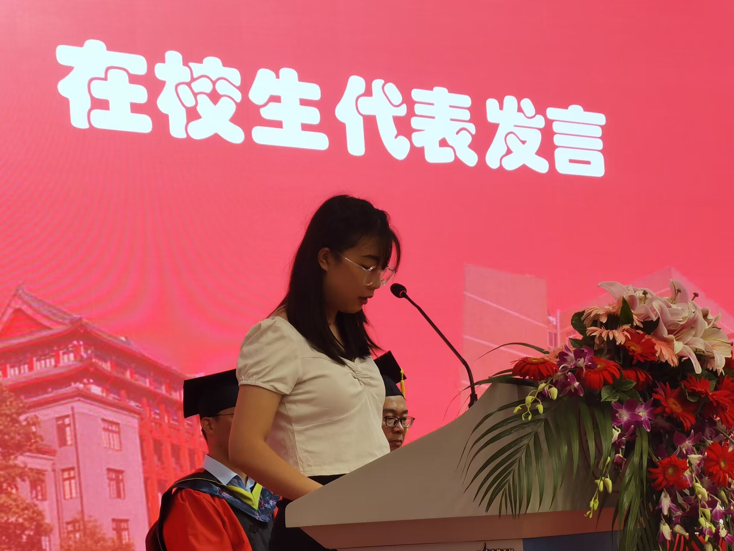 2020级生物工程专业洪梦婷同学作为在校学生代表发言。她代表学院全体在校学生向即将离开母校的学长学姐们表达最衷心的祝福,祝福学长学姐们在未来的道路上一帆风顺,无论选择继续深造还是步入职场,都能够发挥自己的专业优势和个人特长,实现自己的理想和抱负。