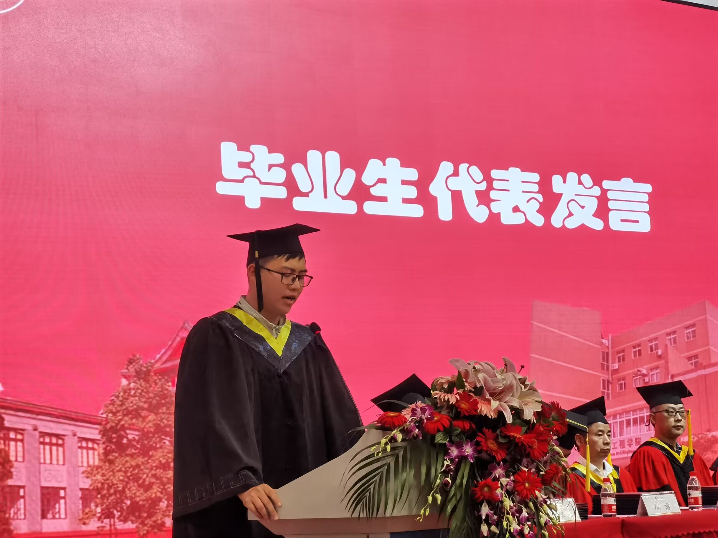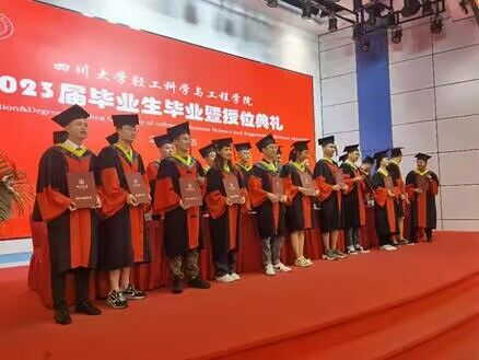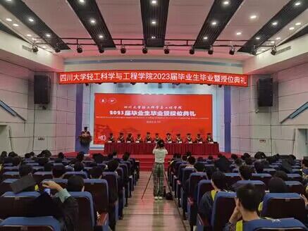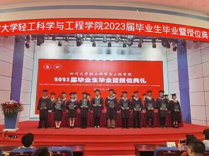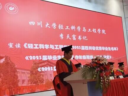 2023届轻化工程专业孙楠同学代表毕业生发言。他谈到,在川大四年的学习,从老师身上不仅学到了专业知识,更收获了治学的态度与人生的准则。虽然大家即将离开校园,踏上新的旅途,但川大“海纳百川,有容乃大”的胸怀时刻滋养着所有学生。他代表全体毕业生同学,感谢学校和学院提供的良好学习生活环境以及丰富的资源平台;感谢所有老师,为学生的学习发展以及后勤保障倾注了大量的心血。最后祝愿老师们工作顺利、身体健康,祝福各位同学扬帆远航,鹏程万里。