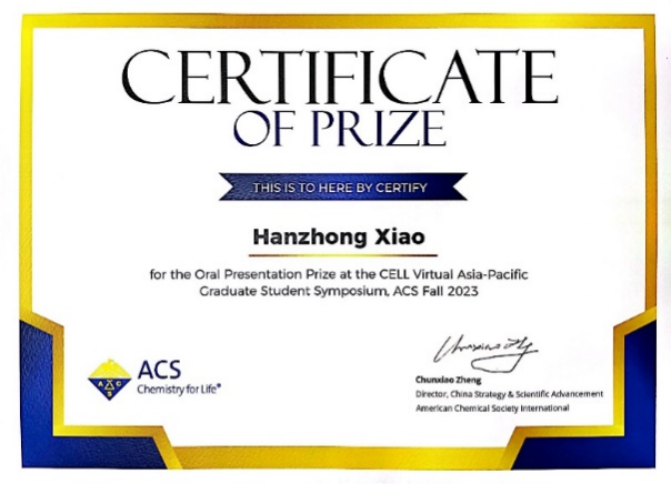 bw必威西汉姆联官网博士研究生肖涵中荣获ACS 2023秋季年会优秀口头报告奖