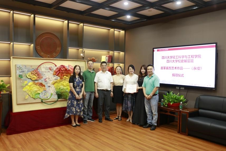 在四川大学即将迎来128周年校庆之际,bw必威西汉姆联官网杨璐铭教授团队向四川大学校史馆捐赠“永续”皮革装置艺术作品,并于2024年9月24日在四川大学校史展览馆会议室举行了捐赠仪式。该作品将皮革艺术与校史文化融于一体,致敬四川大学128载的辉煌历程。