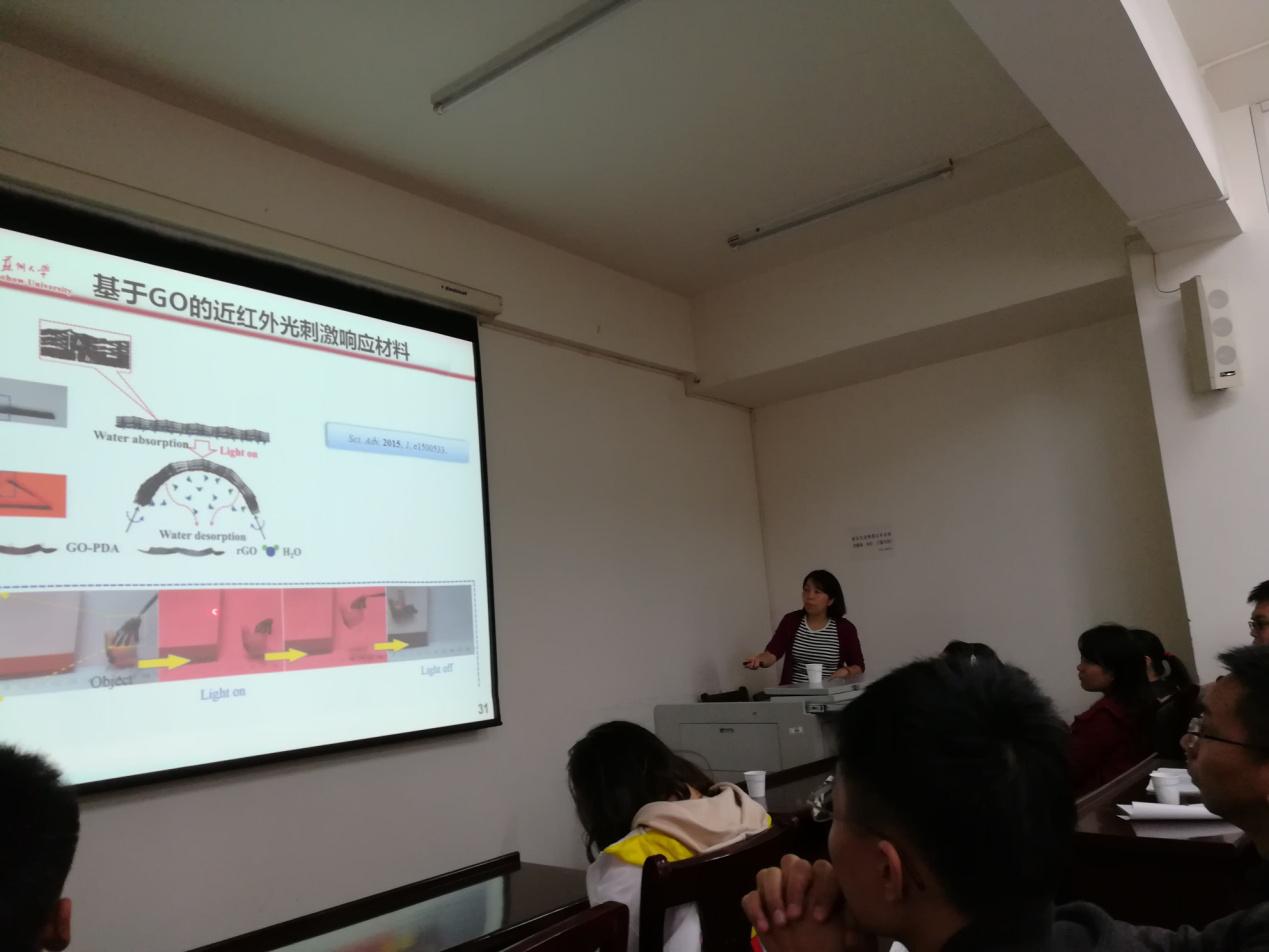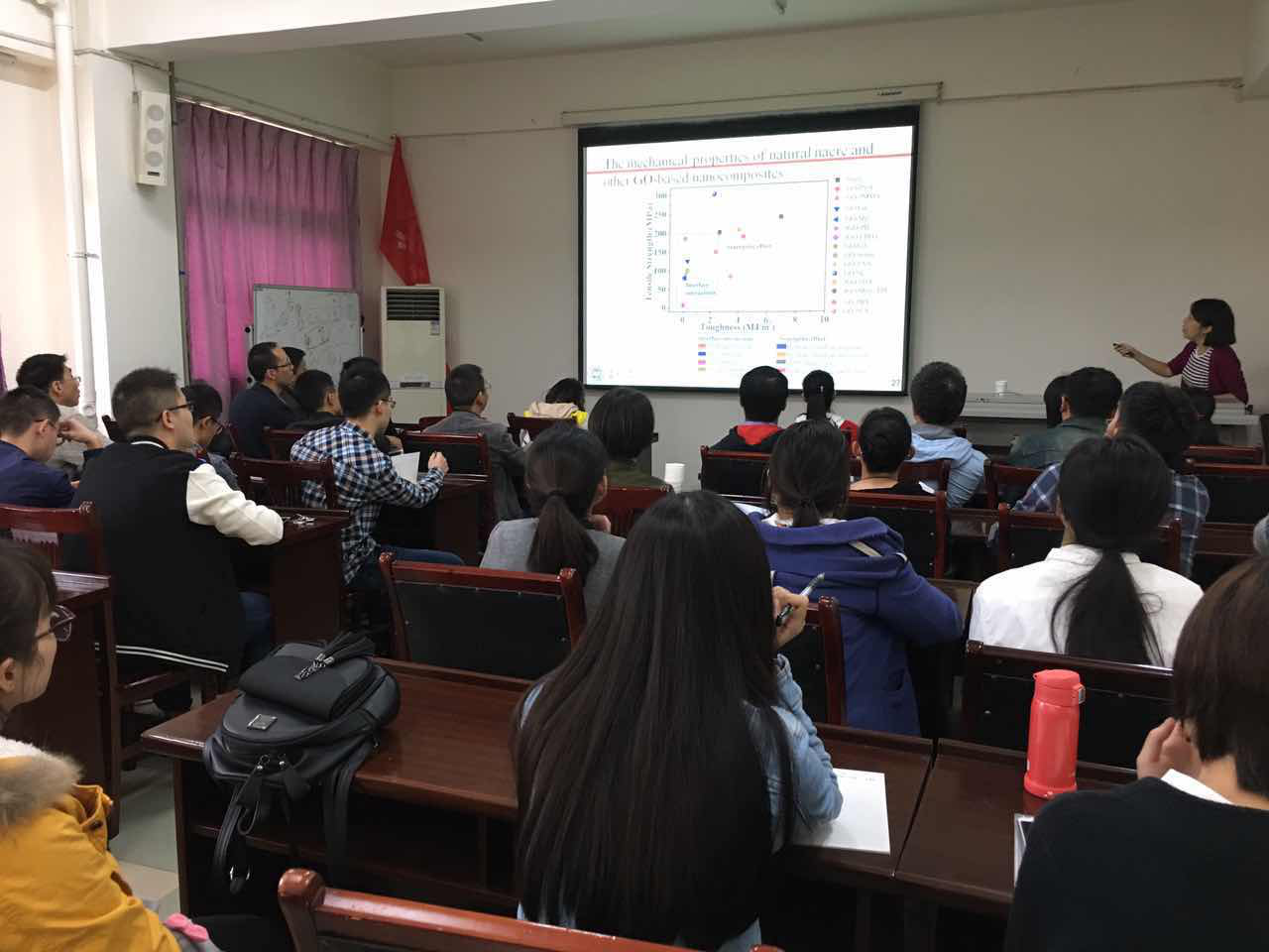 杨晓明副教授本科、硕士毕业于四川大学,在南京大学获高分子化学与物理博士学位,并先后在香港理工大学和宾夕法尼亚大学从事博士后研究和担任访问学者,她的研究兴趣在于石墨烯/高分子功能材料和具有微/纳结构的导电高分子等领域。杨晓明副教授从石墨烯的历史、石墨烯复合物结构的设计及应用等方面开展讲座,报告了她在氧化石墨烯/聚合物层状结构材料的设计、制备及其近红外光响应研究的最新研究结果。杨晓明老师的报告幽默风趣,内容深入浅出,激起了在座老师和学生的浓厚兴趣。讲座期间,师生踊跃发言提问,通过与杨晓明老师面对面的交流,拓宽了bw必威西汉姆联官网师生的研究视野。