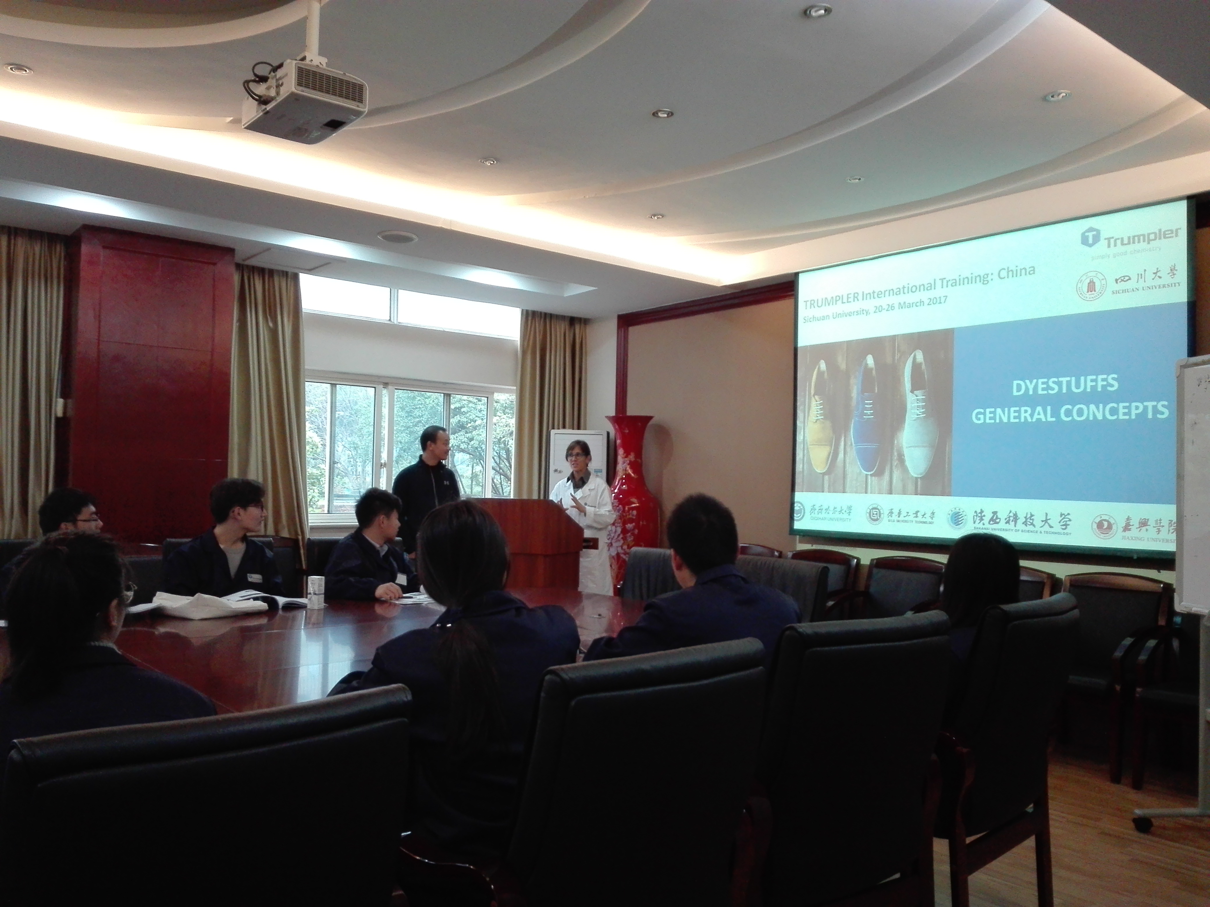 由汤普勒化工染料(嘉兴)有限公司与四川大学轻纺与食品学院联合举办的“汤普勒-四川大学制革技术培训班”于2017年3月20日在四川大学轻纺与食品学院生物质与皮革工程系开班。开班仪式于上午8:30在四川大学皮革楼二楼报告厅举行,开班仪式之后进行了“Open Lecture”。 出席开班仪式的TRUMPLER公司嘉宾有汤普勒中国总裁Mr.Joaquin Linzoain Acedo(西班牙籍)、汤普勒中国总裁张建维先生以及汤普勒德国、汤普勒西班牙以及汤普勒中国研发、推广和技术团队共计12人。