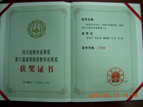 日前,四川省人民政府颁布了“四川省人民政府关于颁布第六届高等教育教学成果奖和第四届普通教育教学成果奖的决定”(川府函[2010]54号)文件。bw必威西汉姆联官网何有节、陈武勇、廖隆理、刘彦、徐波等五位教师的《拓宽专业方向,发挥产学研优势,培养轻化工程专业高素质》获四川省第六届高等教学成果三等奖。