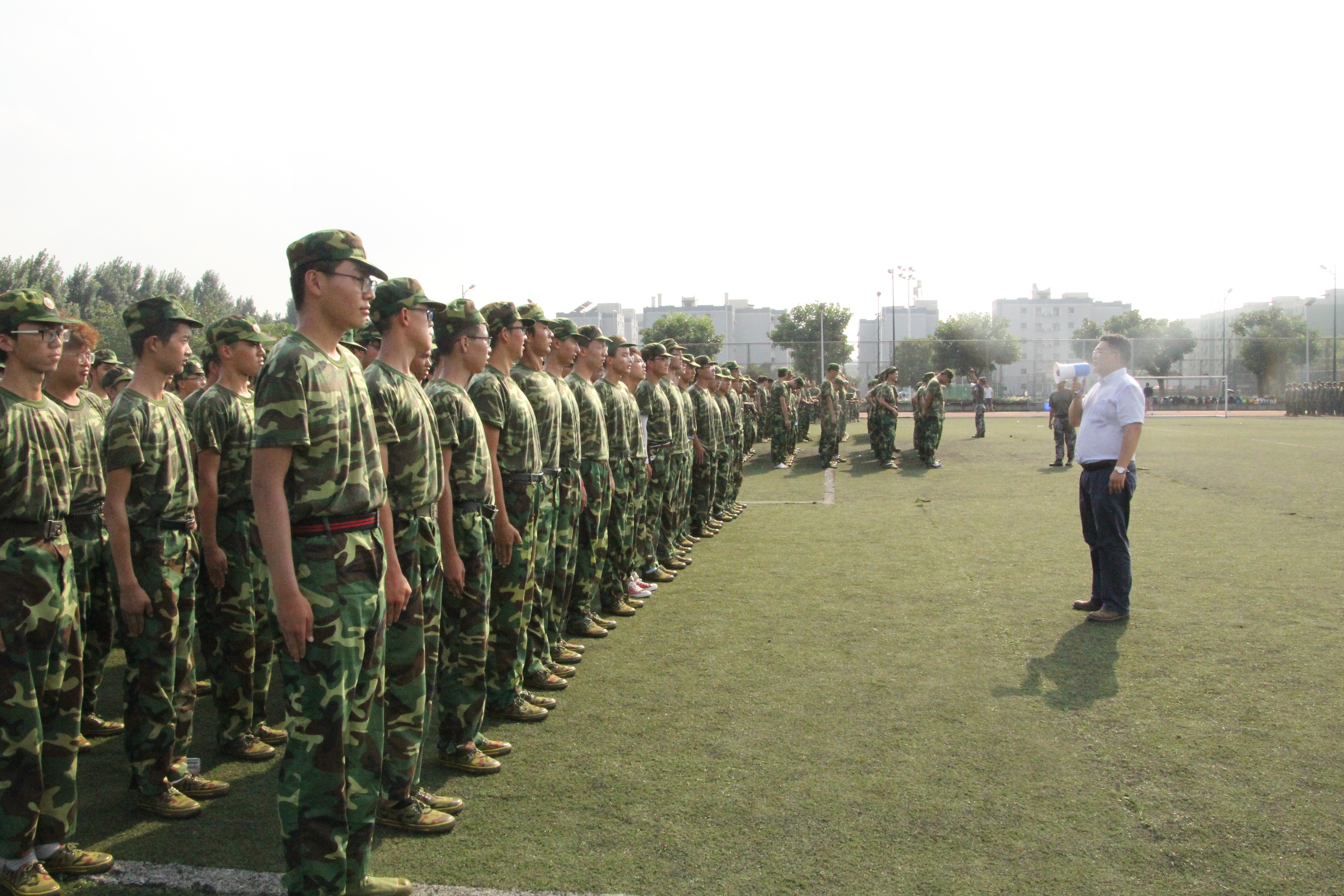 下午4:30开始,参与慰问的学院领导及老师先后来到2017级女生、男生的训练场地,全体同学在责任教官的指挥下,以整齐的队形、挺拔的军姿和饱满的精神状态迎接学院领导的视察。学院党委副书记冯国涛老师首先介绍了前来慰问的领导及老师,随后,学院党委书记刘晓虎副教授致辞,刘书记首先代表学院党政对承担本次军训任务的部队首长及官兵表示感谢,向带队老师和参训学生表示慰问,还特别转达了学院院长何有节教授对大家的慰问之情,让2017级同学感受到了学院领导的关心与关爱。刘书记对参训同学的前期表现表示了充分肯定,同时也对接下来几天的训练提出了几点要求,刘书记提到,军训既是国家兵役法的要求,也是大学生的必修课程,希望同学们珍惜军事训练的机会,增强国防意识,提升军事技能,锻炼身体素质;二是要求同学们在接下来高强度的训练过程中,继续发扬不怕苦、不怕累的精神,坚决服从教官命令,听从指挥,顽强拼搏,保持良好的精神风貌;刘书记强调,军事训练的过程对大家的影响应是长期性的,希望同学们在以后的学习、生活中继续保持军训中的良好状态,使军训成果得到巩固和升华。最后,刘书记预祝全体参训同学能够克服困难,顺利完成军训任务。
