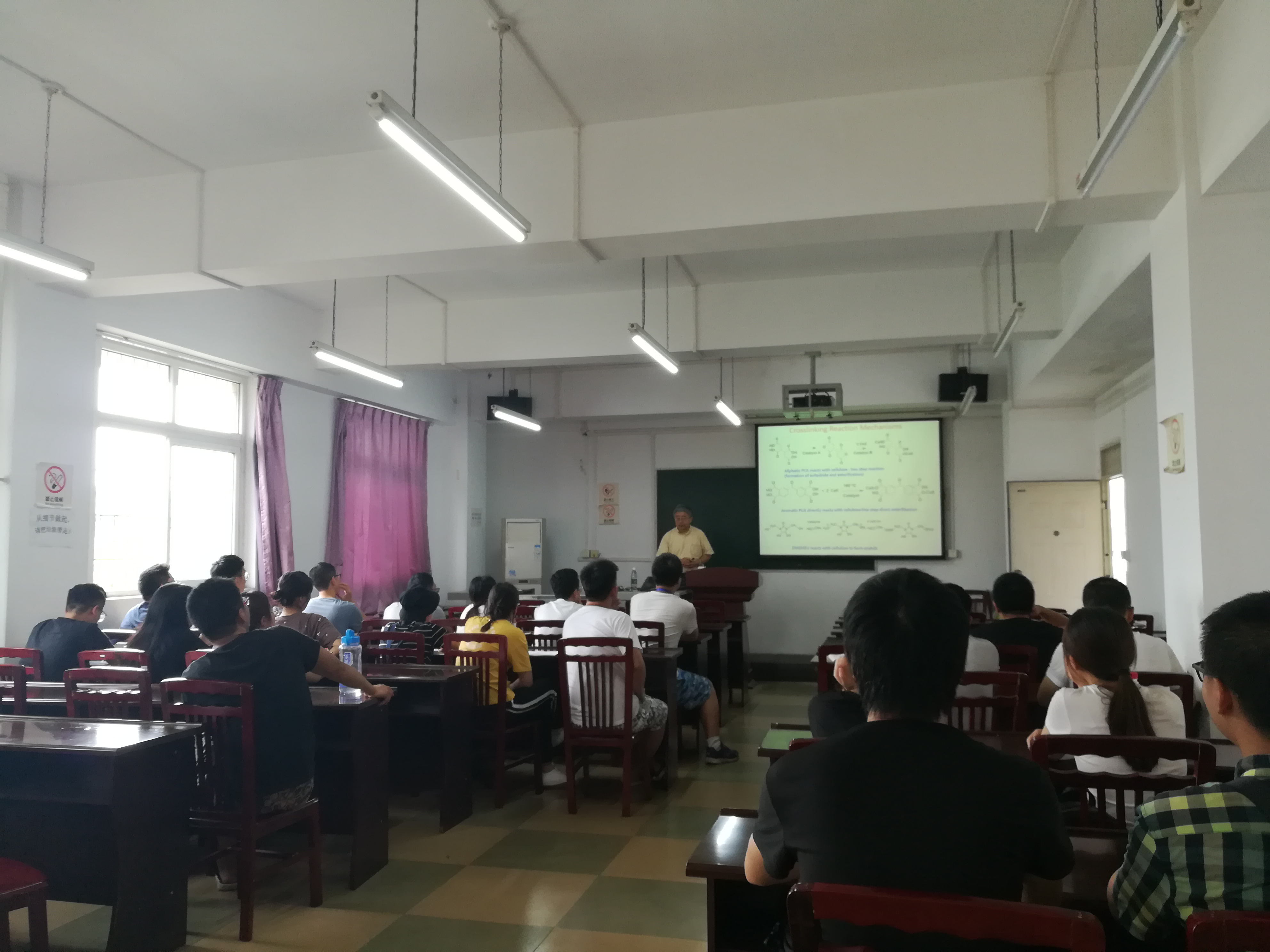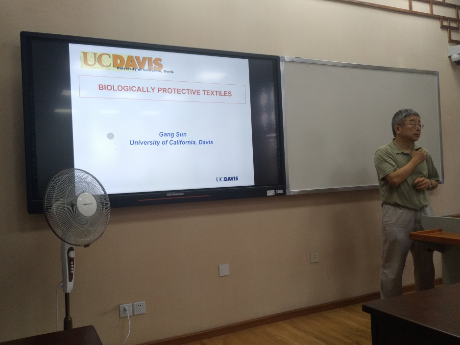 孙教授的全英文课程《Functional Textile》内容涵盖抗静电、抗紫外、抗菌、阻燃等功能纺织品的主要研究方法和最新研究进展。通过为期两周共16学时的课程学习,学生对功能纺织品有了深入了解,同时英语听说能力也有进一步的提升。课间休息时间孙教授还与学生们分享了加州大学戴维斯分校的办学特色和校园风景,并欢迎大家去交流和学习。孙教授高深的学术造诣、严谨的科学思维和启发式的教学方法给大家留下了深刻的印象,得到学生们的一致好评。除纺织工程大二、大三的学生之外,生物工程专业、轻化工程专业、食品科学与工程专业的部分学生也选修了本课程,并取得了优良的成绩。