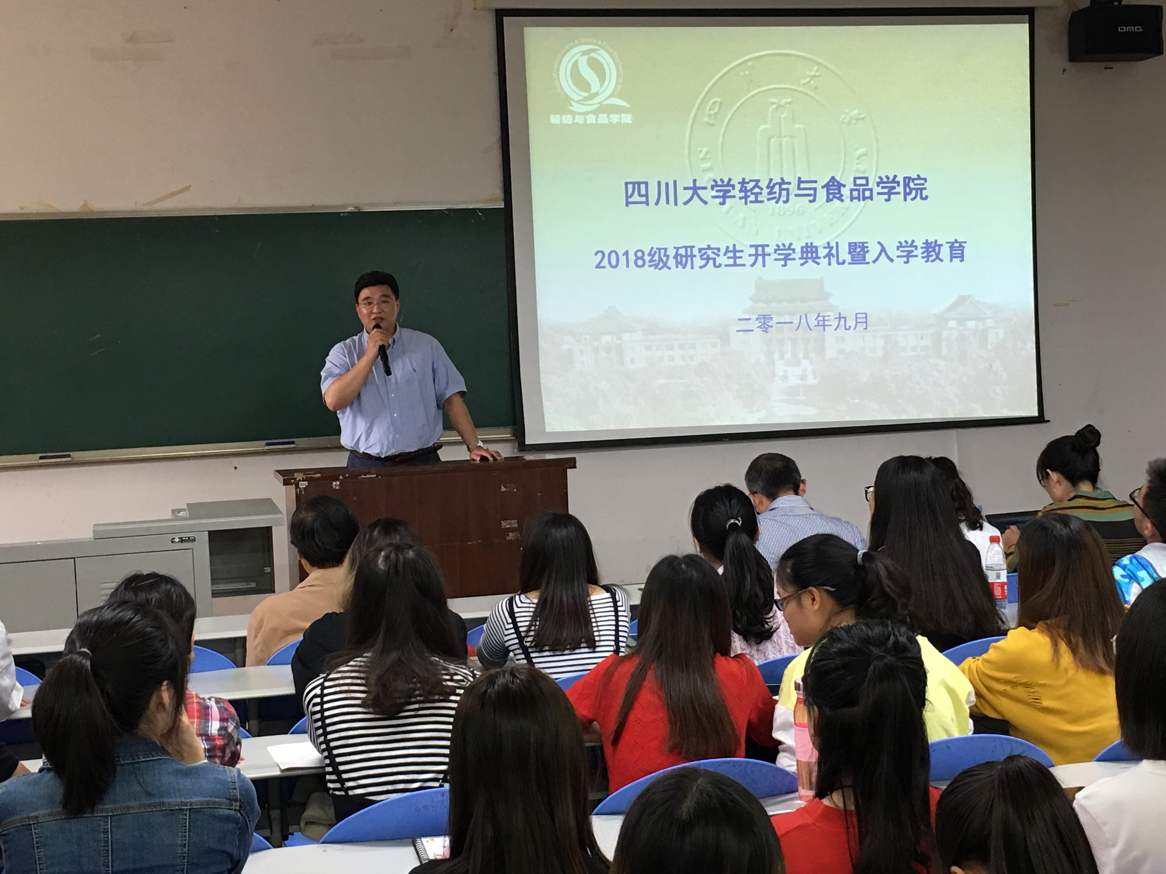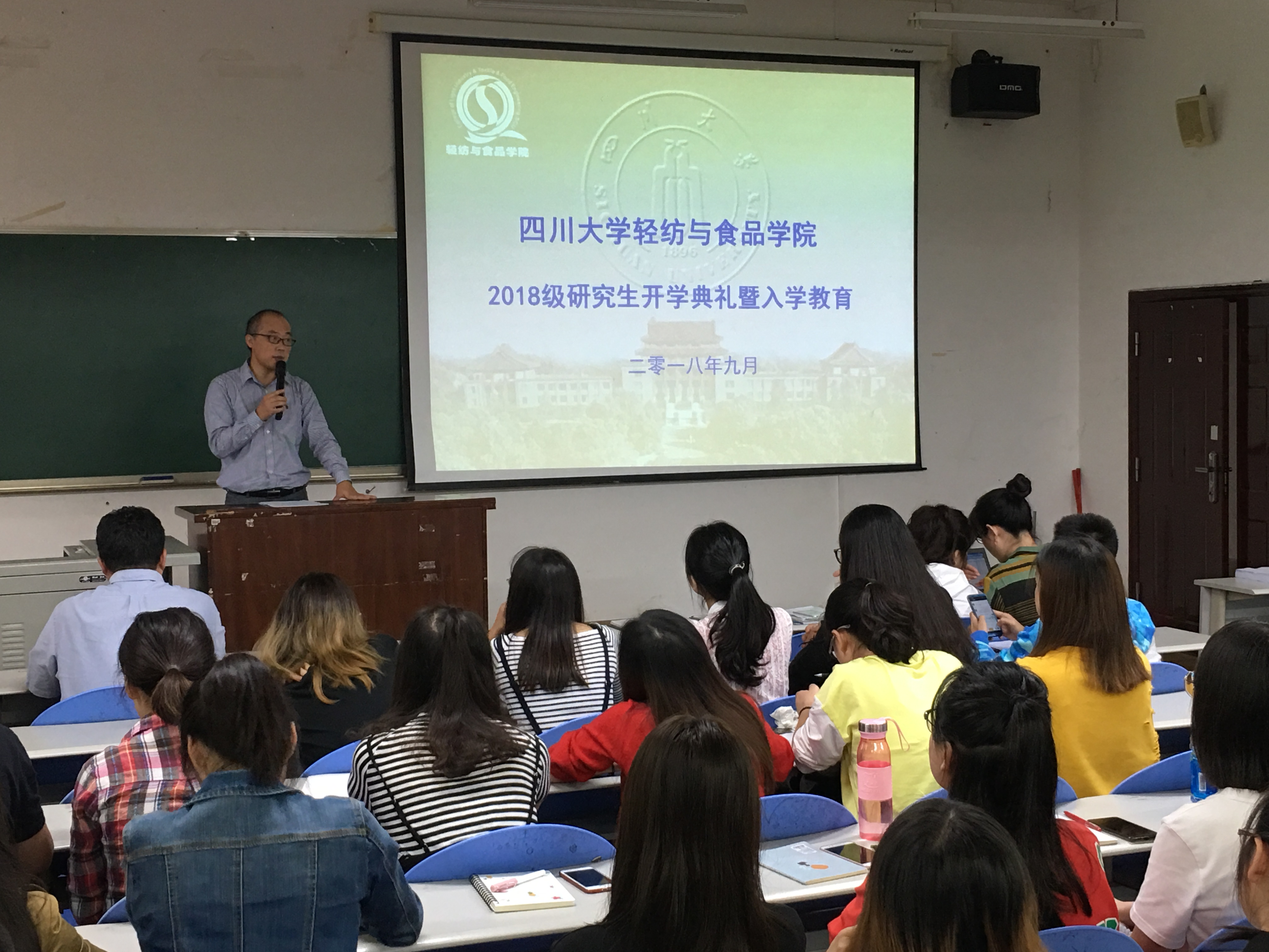 随后,何有节院长从四川大学的发展历史,轻纺与食品学院的学科设置、师资队伍、人才培养、科学研究、对外交流及学生活动等方面进行了全面的介绍,让2018级研究生新生对学院有了更全面、深刻的认识,并为在这样的团队中学习感到自豪与骄傲。