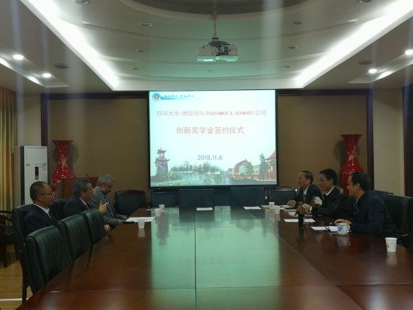 张建华总经理和何有节院长分别代表司校企双发在“德国司马化学(ZSCHIMMER & SCHWARZ)有限公司与四川大学轻纺与食品学院合作协议书”上签字,并相互致贺。自2008年起司马公司在四川大学皮革系设立“司马创新奖学金”,至今已有十年,累计资助了100多位研究生、本科生、成教生开展科研创新。