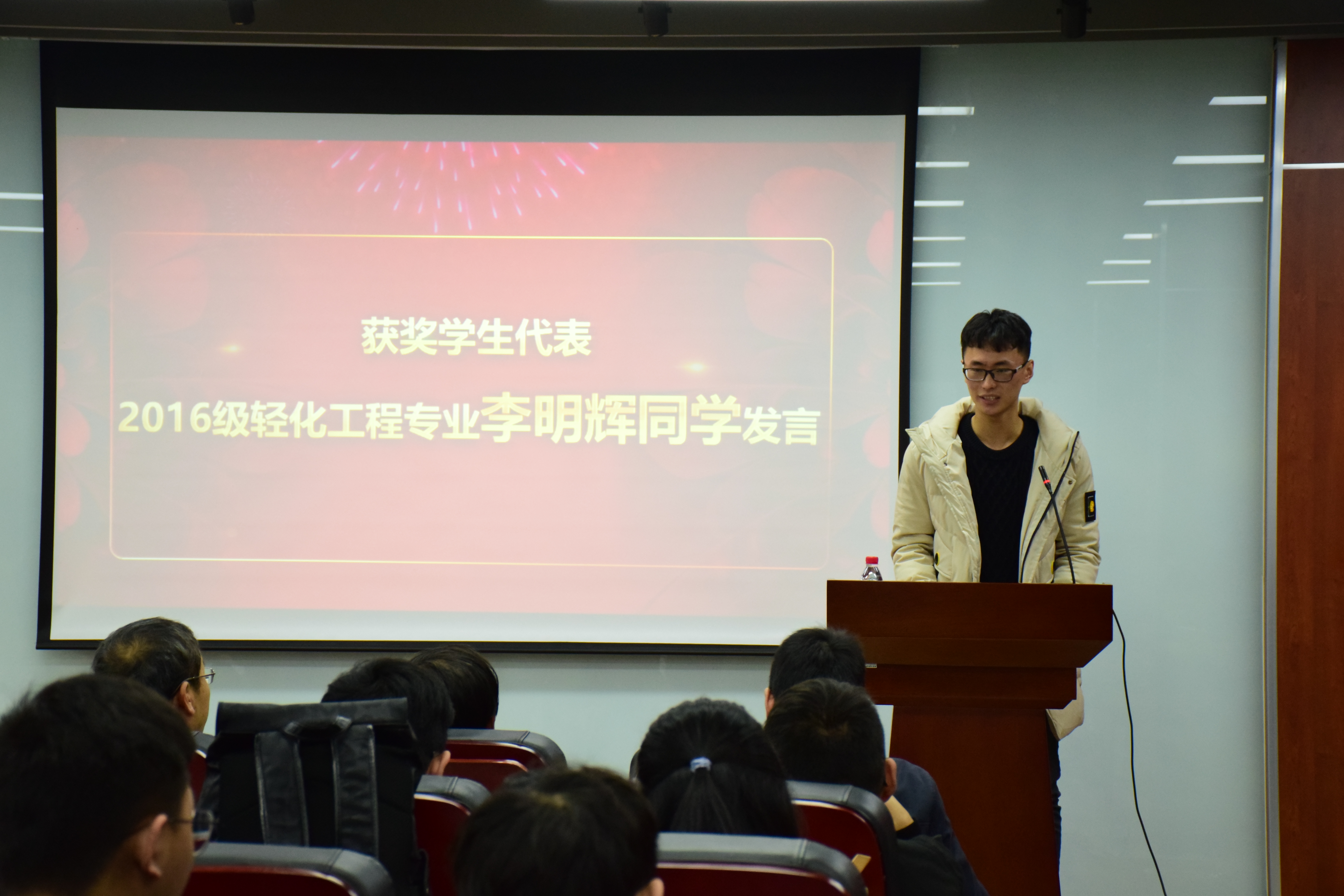 随后,轻纺与食品学院党委副书记冯国涛老师宣读了《关于表彰轻纺与食品学院生物质与皮革工程系2018年度优秀个人、优秀班级的决定》。在隆重的颁奖音乐中,学院领导及与会嘉宾为获奖同学一一颁奖并合影留念。最后,获奖学生代表,2016级轻化工程专业李明辉同学发言,表达了对设奖单位的感谢,对学院生物质与皮革工程系长期的培养与教育表示谢意,并表示一定以此为新的起点,继续努力,取得更优异的成绩回报行业、社会以及学校。