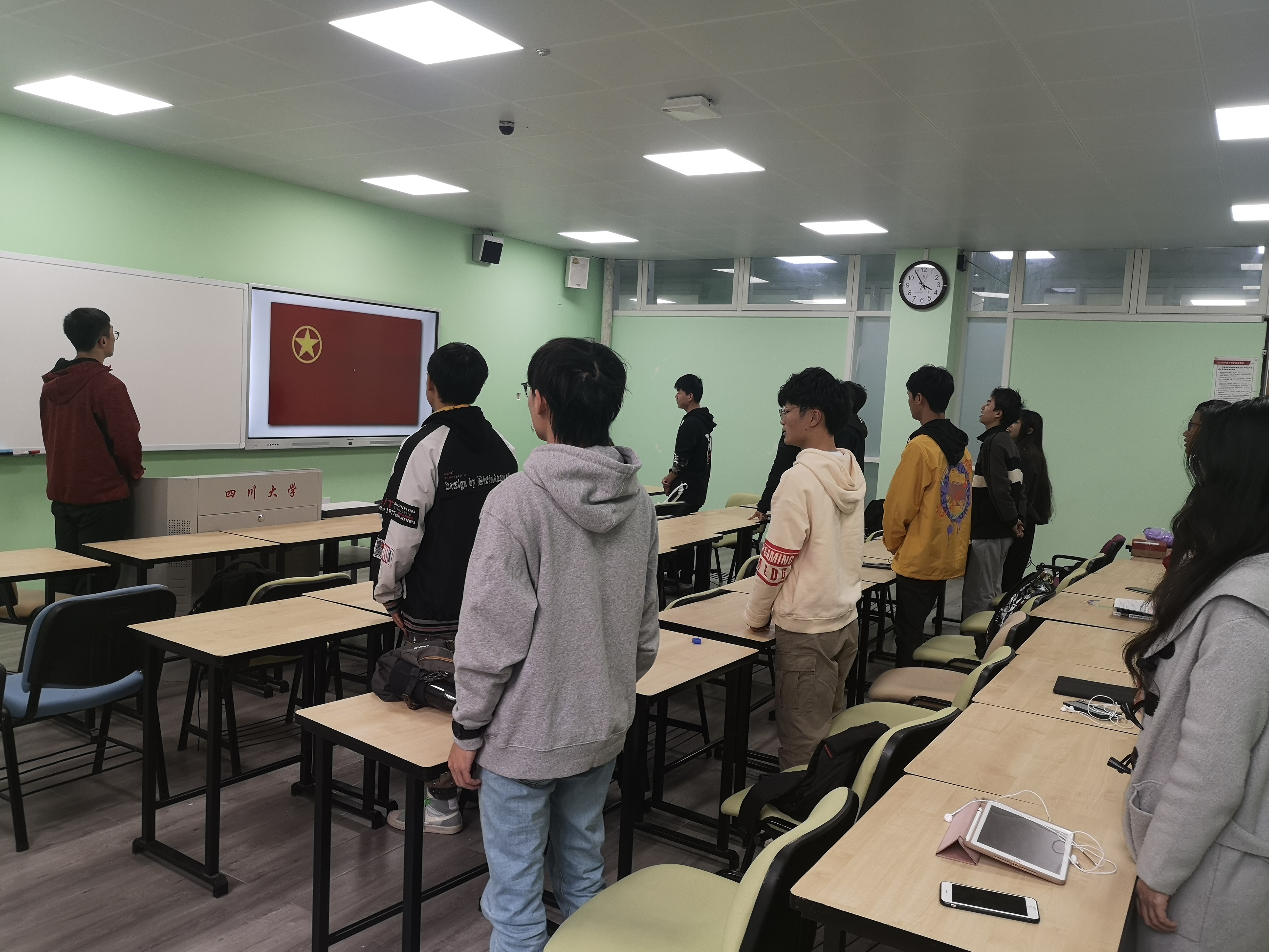 在主题团日活动中,各班团支书和部分同学紧密结合自己的生活学习经历,生动的讲诉了发生在自己身边的感人事迹、奋斗故事、共产党为什么“能”、祖国70年的辉煌历程等,引导同学们认真领会十九届四中全会精神,激发同学思考在坚持和完善中国特色社会主义制度、推进国家治理体系和治理能力现代化的进程中我们青年一代需要做的努力。