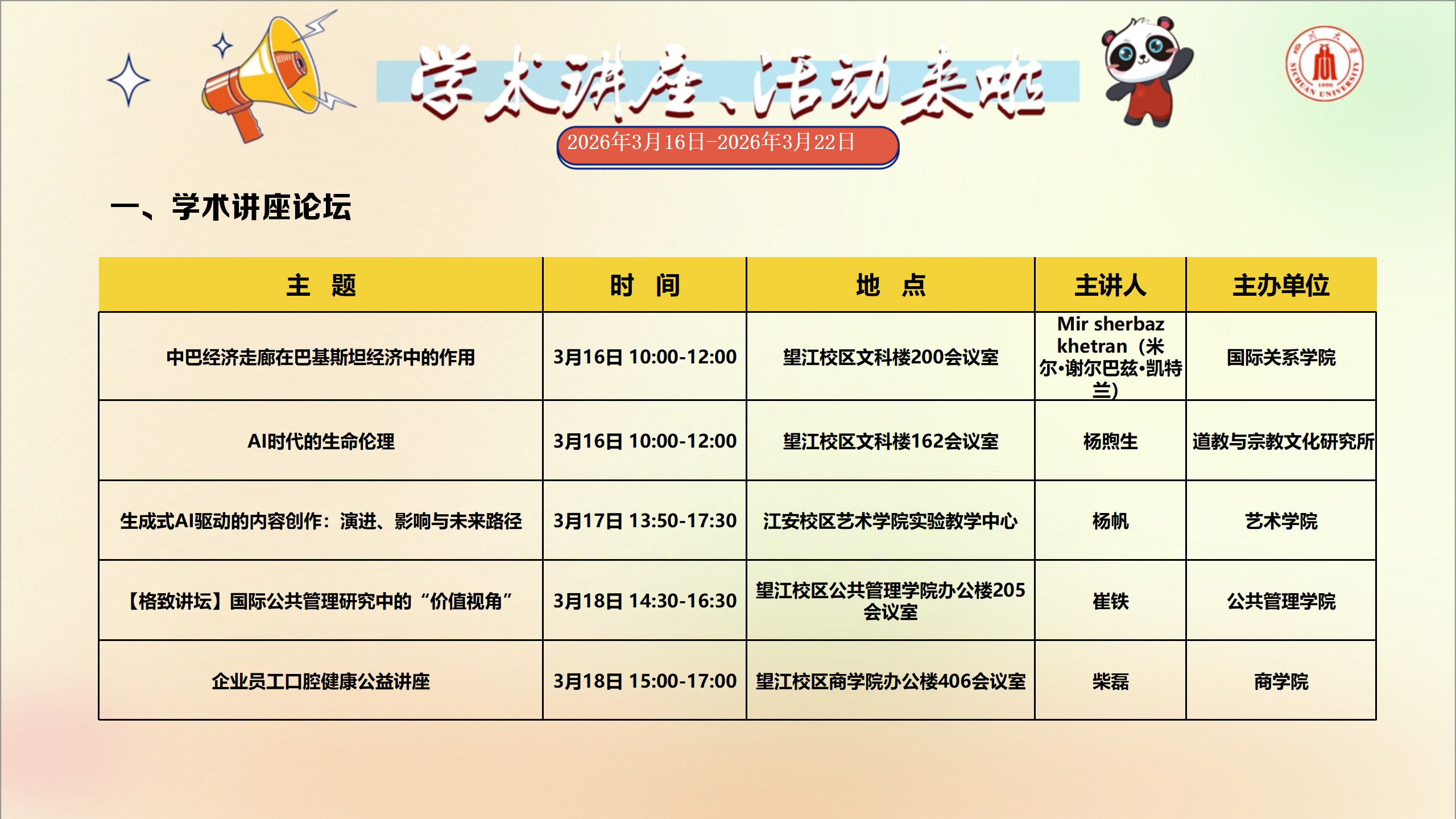 学术讲座预告(2026年3月16日-2026年3月22日)