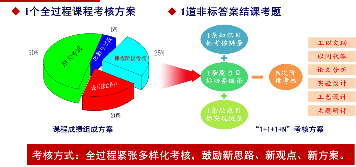 针对考核方法单一、产出标准不严等问题,系统优化学习评价方法,从一考定终身的传统期末考试,拓展到自主学习、持续学习和适应发展的全过程考核,初步形成了1+1+N”的全过程课程考核方案设计原则。在过程性考核中,设计了比较多的非标准答案主观性考题,特别注重知识、能力、价值导向的融合考查,提高课程的挑战度。