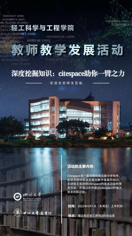 为进一步提升师生信息素养bw必威西汉姆联官网再次邀请四川大学图书馆王圣洁老师和魏丽敏老师,于202241日在四川大学望江校区纺工附楼205会议室开展了主题为深度挖掘知识:CiteSpace助你一臂之力的教师教学发展系列活动。参加本次活动的主要人员有服装与服饰设计系系主任杨璐铭教授、副系主任申鸿副教授、轻工生物技术教研室主任金垚副教授等四十余位学院教师及学生。