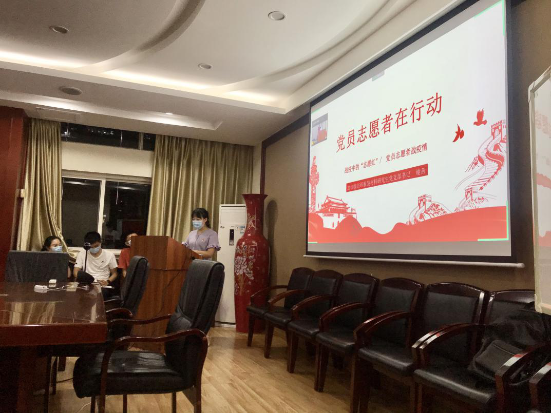 2019级纺织服装研究生党支部书记谢茜同志分享了疫情期间自己作为党员志愿者在行动的经历感受,介绍了该支部党员志愿者在社区、加油站、交通枢纽点等开展志愿活动情况,向与会党员展示了在这场严峻的战“疫”中,广大青年党员志愿者挺身而出,用自己的实际行动展现出青年一代的责任与担当,汇聚起战胜疫情的强大青春力量。